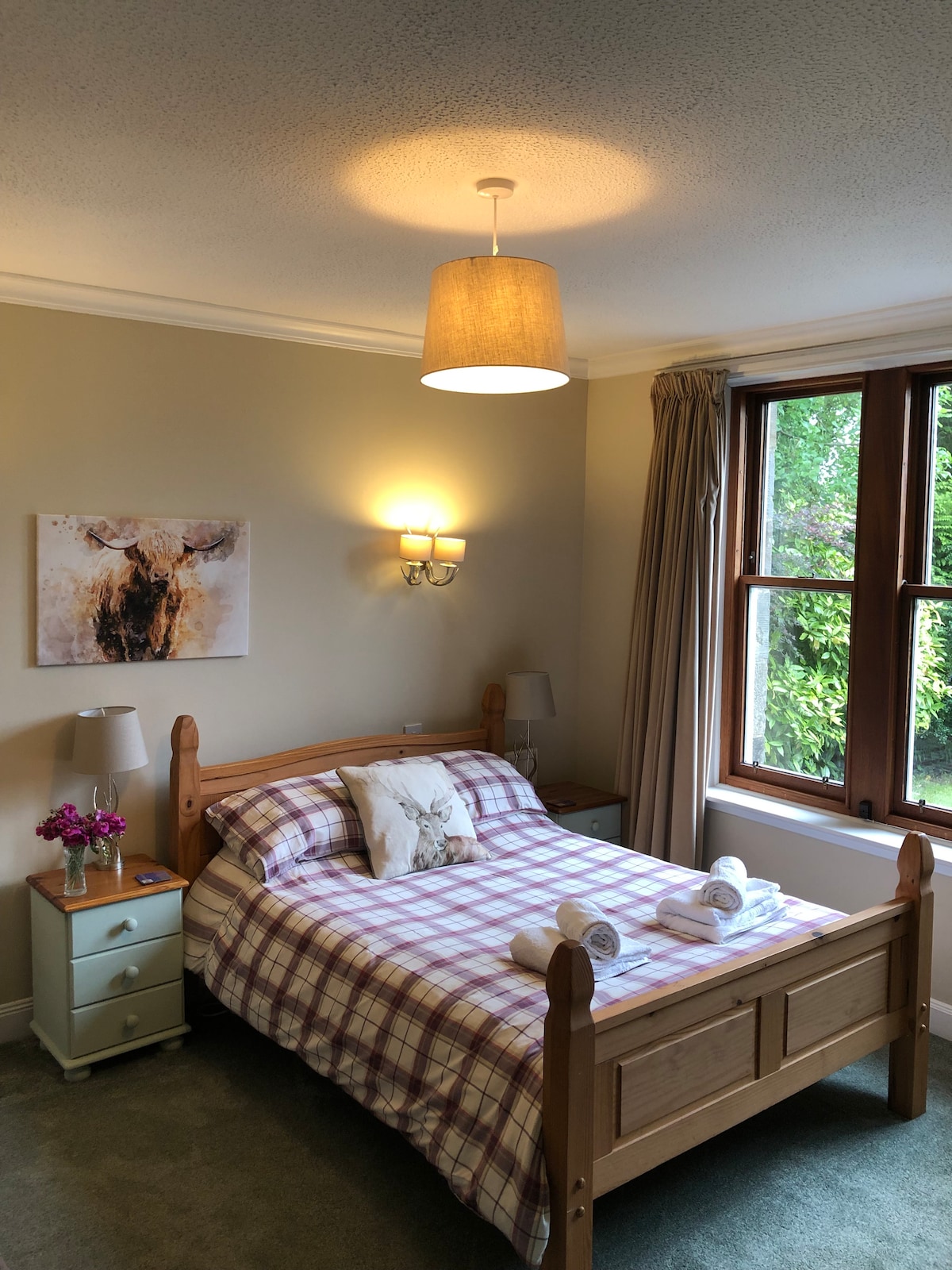 There is a hallway, bedroom and bathroom for your exclusive use. The bedroom is a large room with a double bed, sofa, and table and chairs. We have used a Scottish theme to decorate the room.