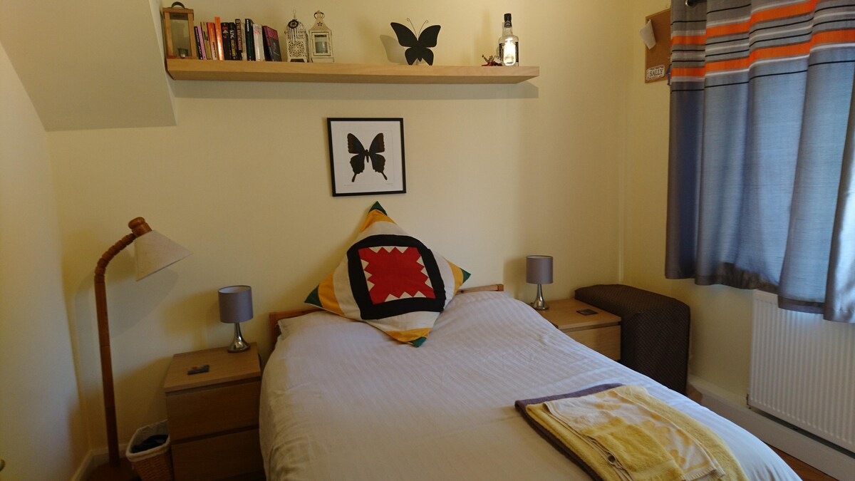 Lovely upstairs bedroom, TV, chair, desk & pc, microwave, kettle, plates etc, for easy meals.