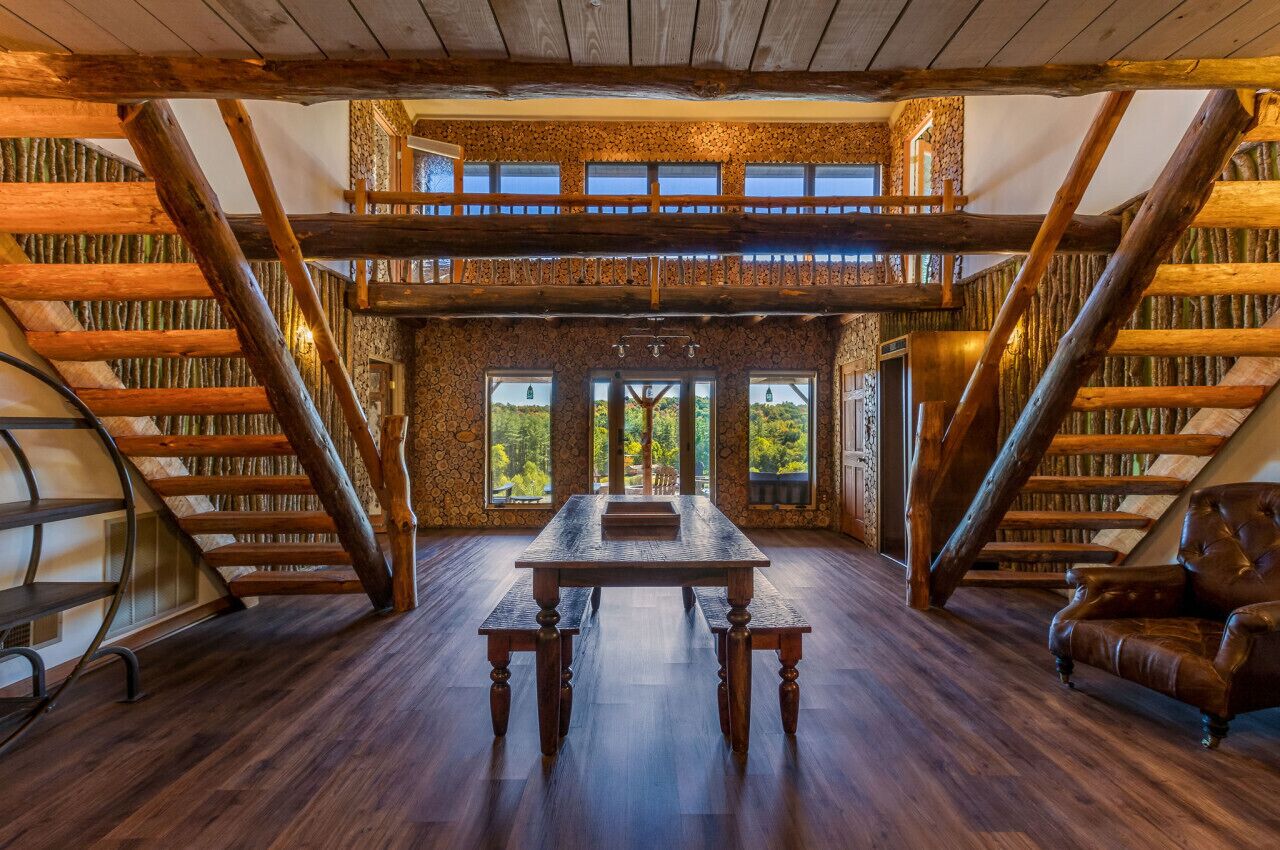 Perfect for groups, the cabin comfortably sleeps 9. The airy loft offers space for 5 with a twin bed, full bed, and a daybed with a trundle pull-out. The main floor features a king bedroom for 2, while the walk-out basement includes a queen bedroom for 2. Each level boasts a full bathroom with a shower for your convenience.