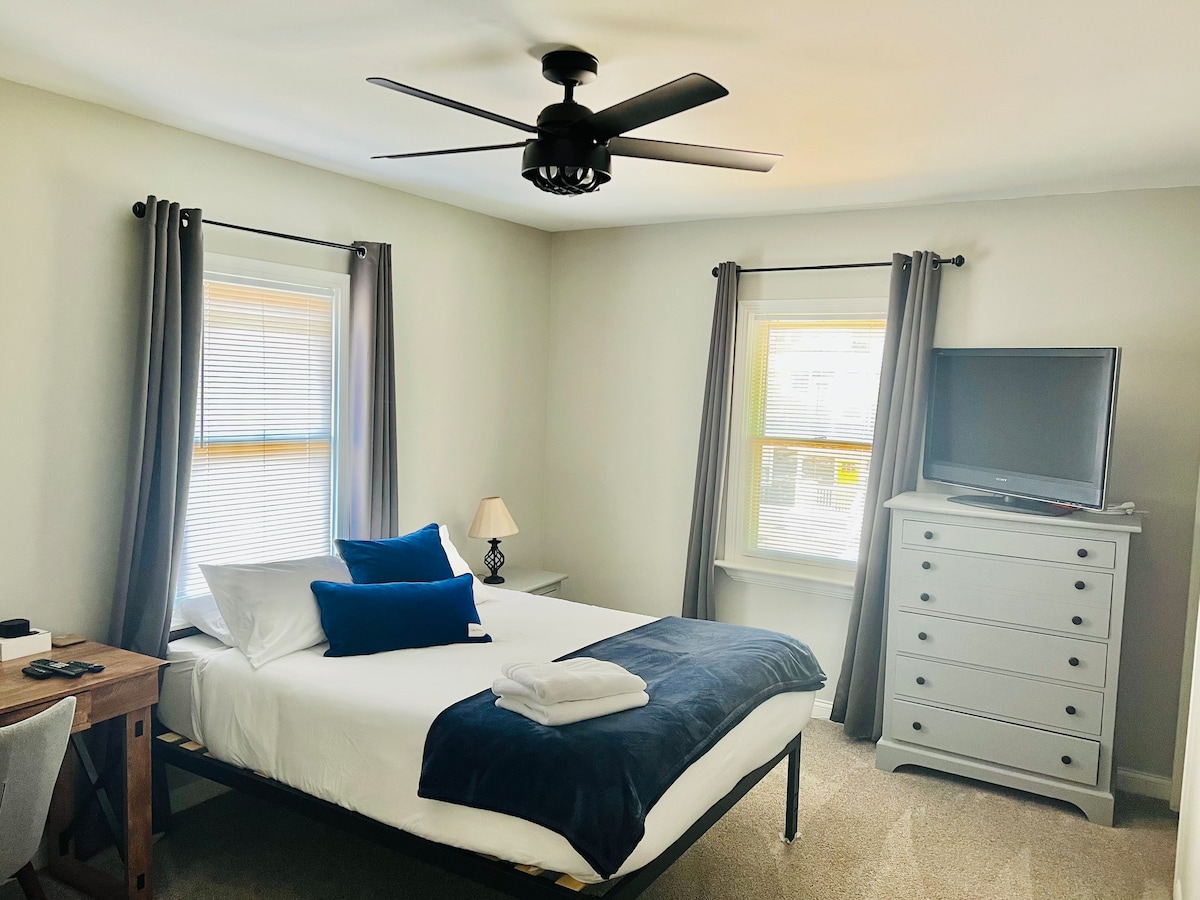 🛏 Private Bedroom: Rest easy on a plush queen-sized bed with crisp linens for a great night’s sleep. A 32-inch Smart TV ensures you can unwind with your favorite shows or movies.