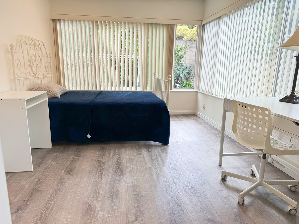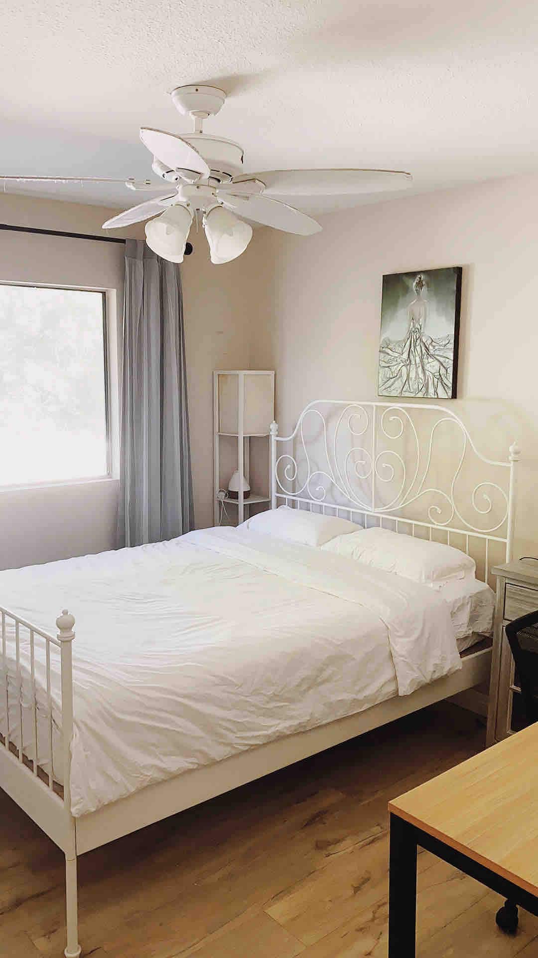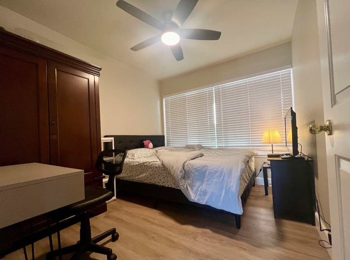You will have a quiet bedroom as your little office, share full-bath with another girl. The room is equipped 1queen bed, desk set, 1 TV, ceiling fan, wardrobe, side table,a window to natural light.Free laundry,parking. It located in a very convenient location: walkable to Ralph, Daiso, Mituwa, Trader Joe, Starbucks, bakery, a lot of restaurants , swim pool, tennis, basketball courts, trails, parks and libraries. So convenient that you can live without car if you don’t need to drive to work(WFH).