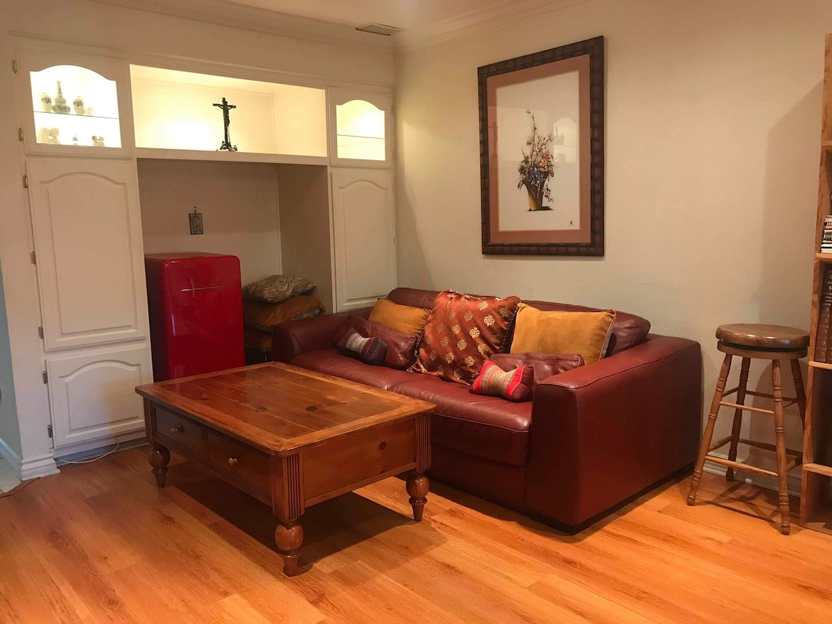 At the cottage there will be no one above you or below you and no shared walls. This is a detached house with it's own, direct access garage. The home is professionally decorated, highly maintained and fully equipped for your stay. You will love the upscale touches like hard wood floors throughout and new marble floors in the bathrooms. The well stocked, upgraded kitchen features stainless steel appliances and new counter tops. The kitchen has direct access to a private patio with sitting area and gas BBQ grill. The perfect place to relax and enjoy the beautiful southern california weather! The master suite features a California king bed, big flat panel Smart TV and a private bathroom. The second bedroom has a comfy Queen size bed and flat panel tv. The comfortable living room has a 55" Smart TV, fireplace and a Queen size sofa sleeper. The newly added front patio is very popular with our guests for morning coffee or evening drinks!