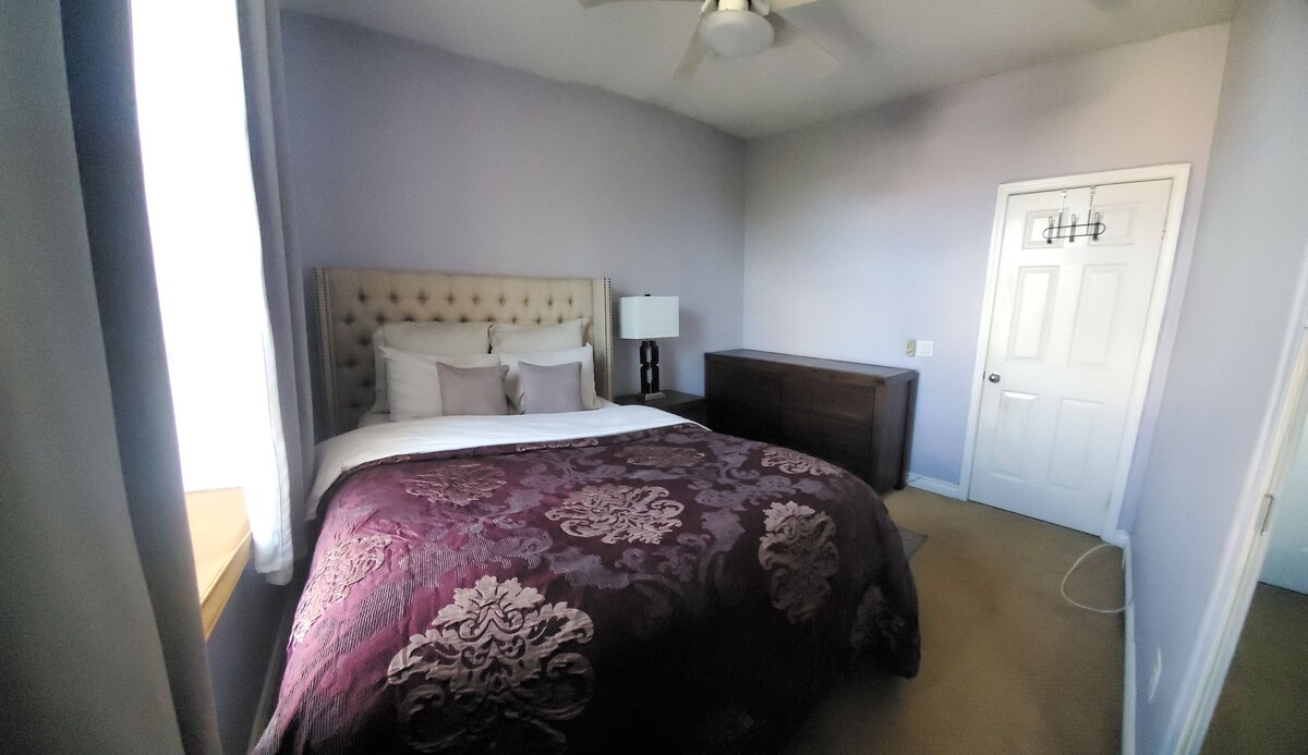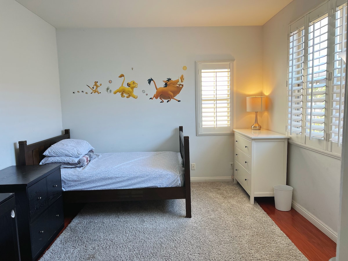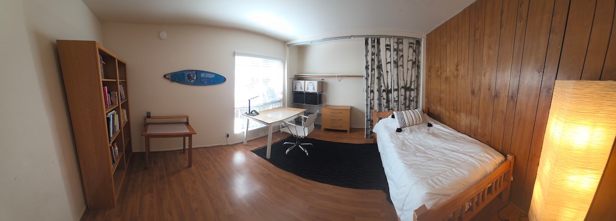 This room is in a single-story house, conveniently located with 5 different groceries within walking distance. There are plenty of nearby restaurants and shops, and even with ample parking, you might fall in love with walking here. You can walk to the pool, or enjoy the park connected to the backyard. The room has a queen bed +a 12-inch mattress,desk,fan,closet,shared bath. You can work by the floor-to-ceiling window or enter the backyard directly from your room. Ideal for quiet professionals.
