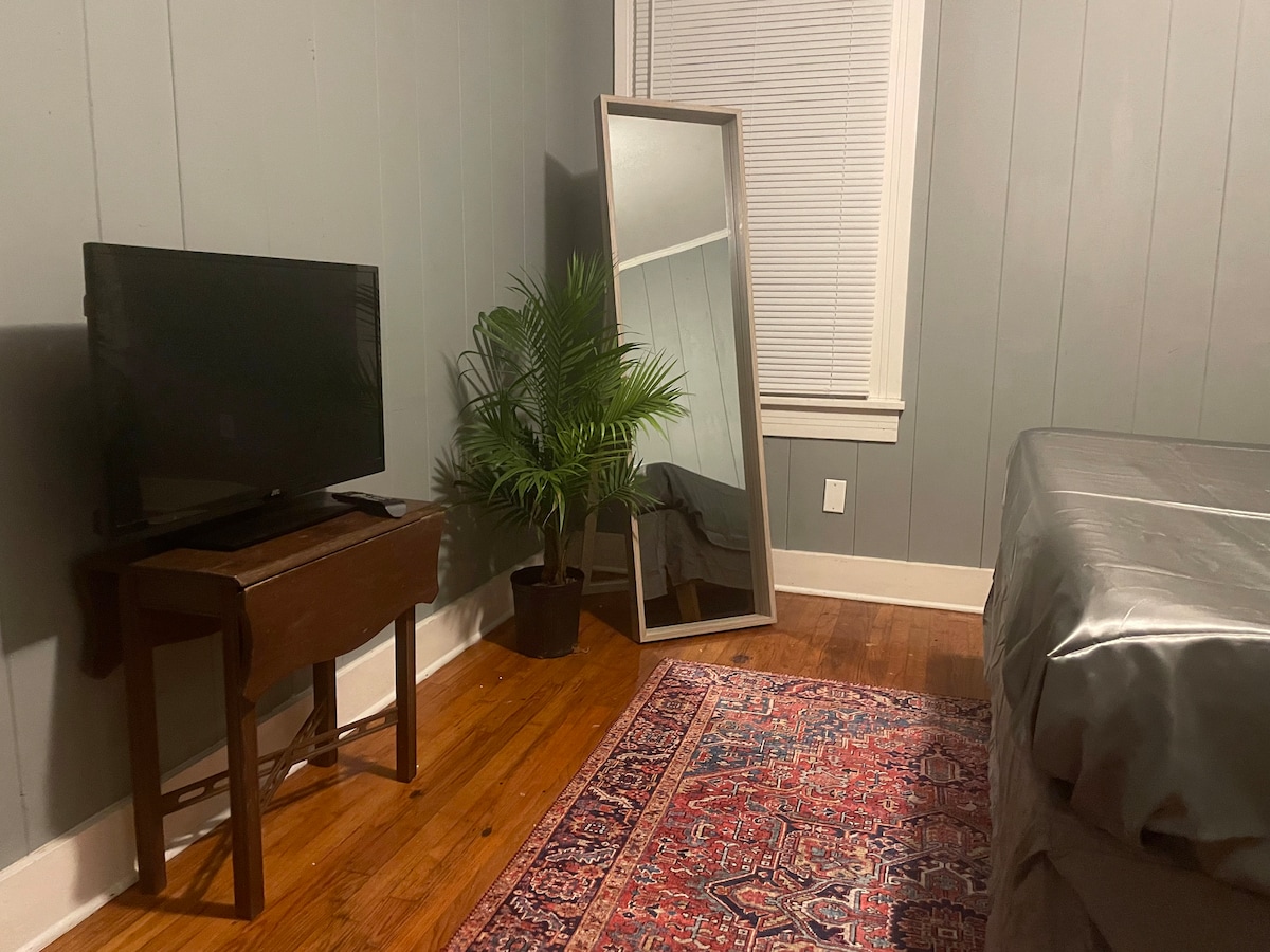 - "My son and I stayed here while we were visiting colleges in the area. The home is a second floor unit that has its own entryway separate from the bottom unit. There is also a small building in the rear that looks to be an additional unit or storage area. Parking is on the side of the property just across from a wonderful BBQ joint. The home is decorated nicely and the furnishings are comfortable. The space is a bit small but it serves perfectly as a home base for your excursions. Air conditioner works great and there are ceiling fans located in every room needed. The only two concerns were that the refrigerator water dispenser and ice maker weren't working, and that the living room TV was mounted on a wall that didn't allow anyone to really enjoy it without moving the couch to a better vantage. These are easily remedied! We very much enjoyed our stay!"