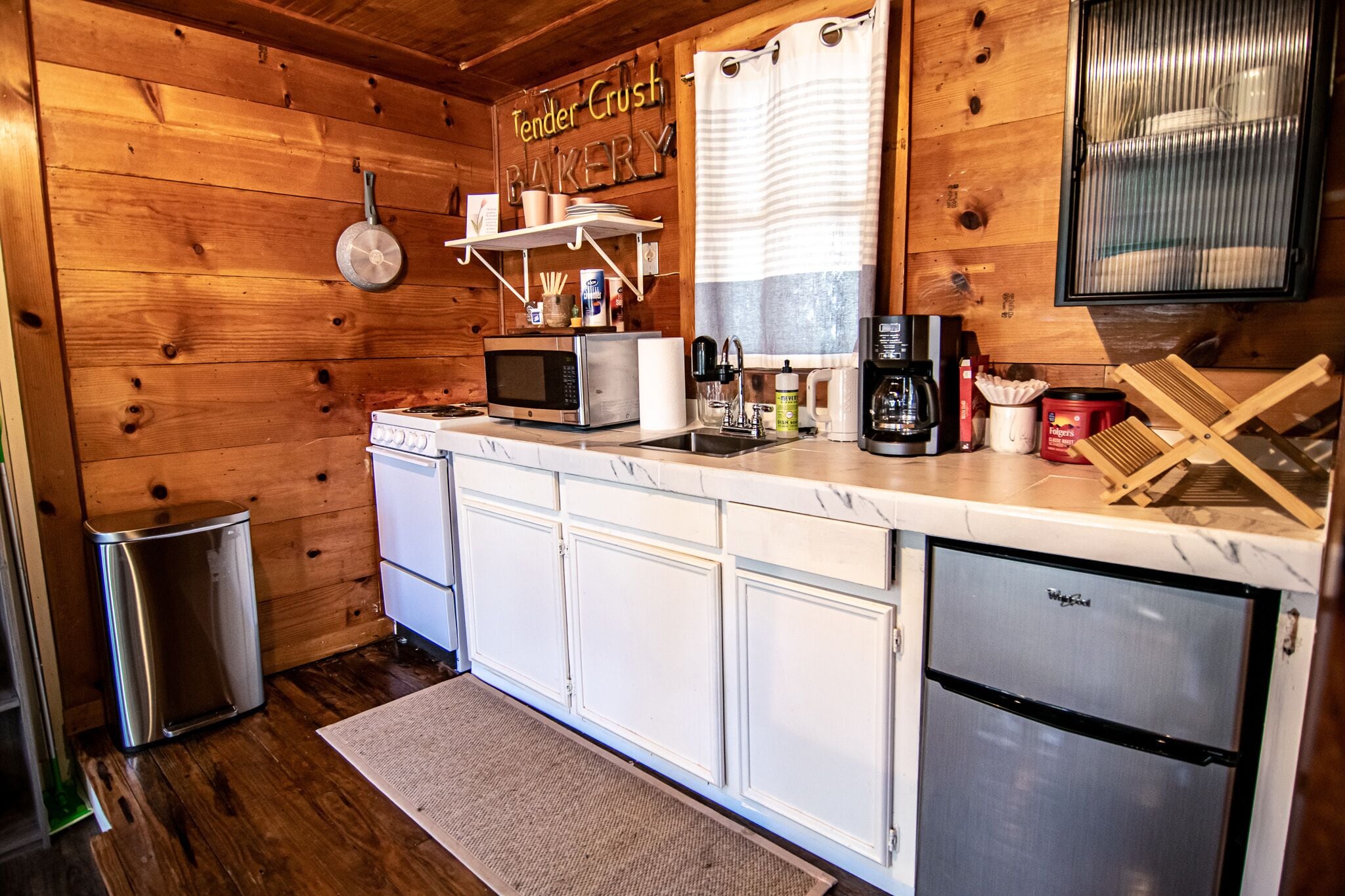 The house has been completely updated to include a bathroom (which also has one step up) with double vanities, a walk-in shower that includes a shaving ledge, and a washer/ dryer unit. There is a full kitchen that is well supplied for those that want to prepare meals and a bar top that accommodates 4 people. The bedroom is it's own room with closing doors for privacy; there are 2 steps going down into the bedroom. In the living room, we have a sleeper sofa along with a large 50" TV with an Amazon Fire Stick, use of our YouTube TV account (in lieu of cable), and even many DVDs to choose from if you want to go Old School! We provide all paper products, shower products and all linens. We even provide niceties such as some bottled water, coffee for the Keurig, snacks, and other small things to make it feel welcoming. We also have a small patio table outside with a wood burning fire pit for your use when the time comes.