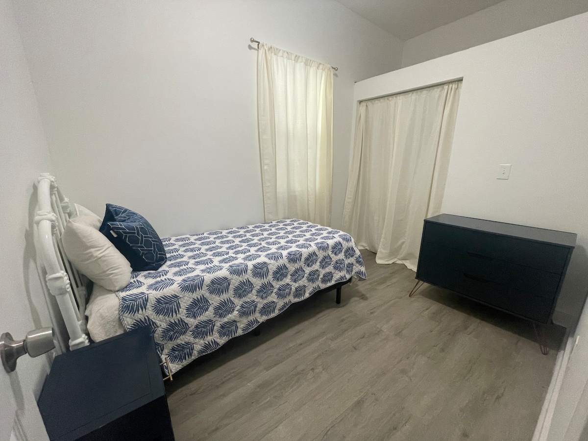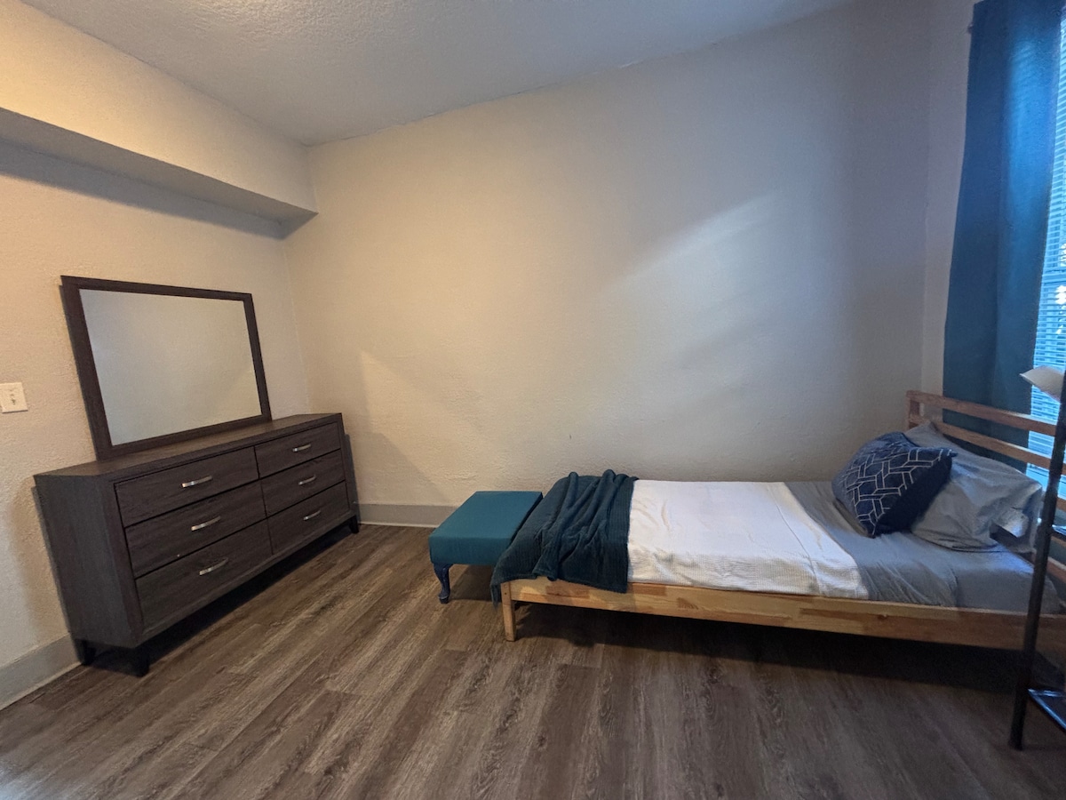 Private bedroom with a lock and key door. The room has a queen size bed. Standard closet size. Two windows for natural lighting.
