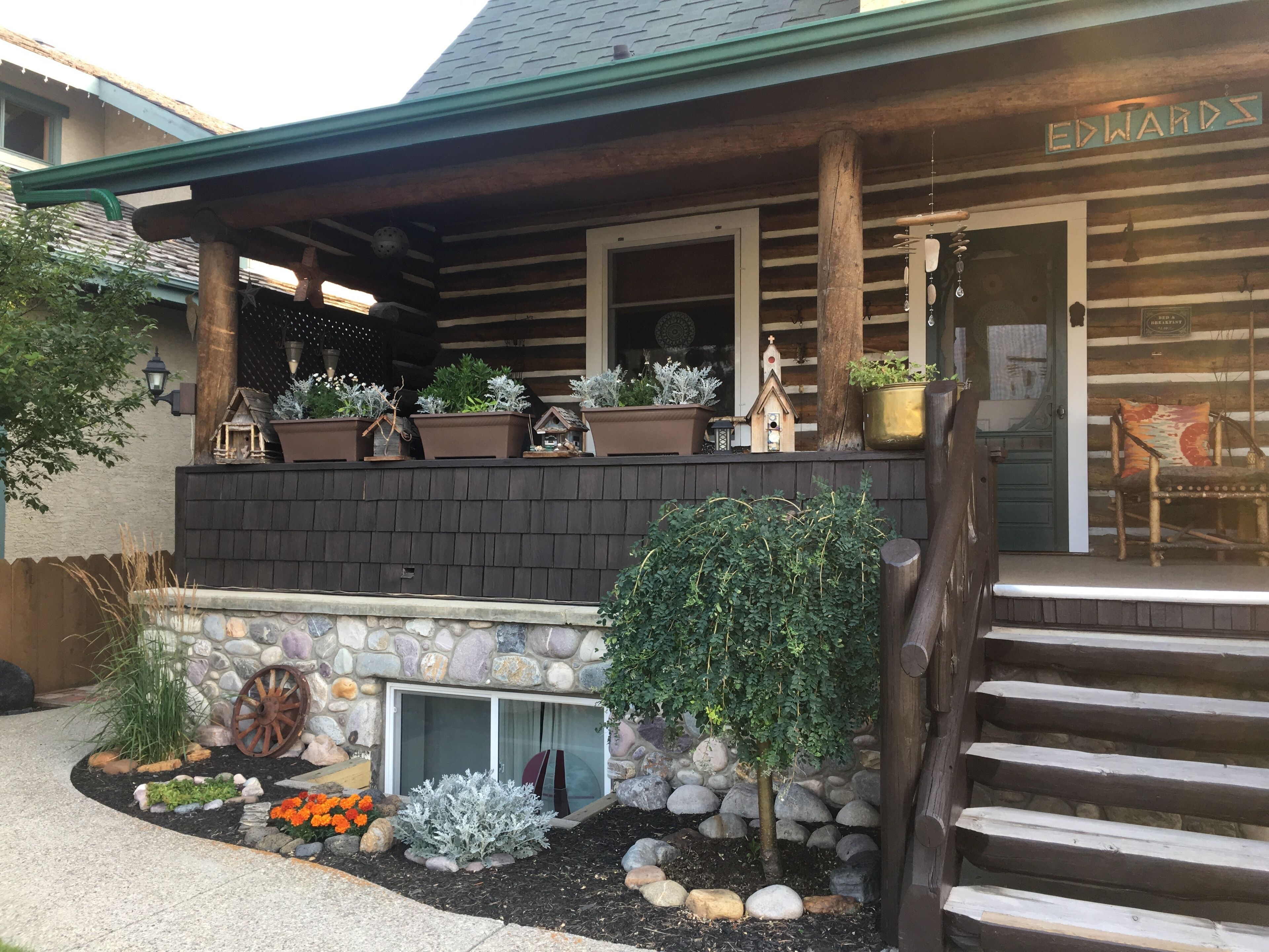 Your private, tastefully decorated, bright and sunny suite is in the lower level of our newly renovated, historical log house and offers a lovely mountain view. The log theme decor ensures a cozy and relaxed atmosphere. The suite is designed with your comfort in mind and offers everything a home away from home should have. It is an ideal set up for two couples or a family of four travelling together, providing each with their own private bedrooms and bathrooms.