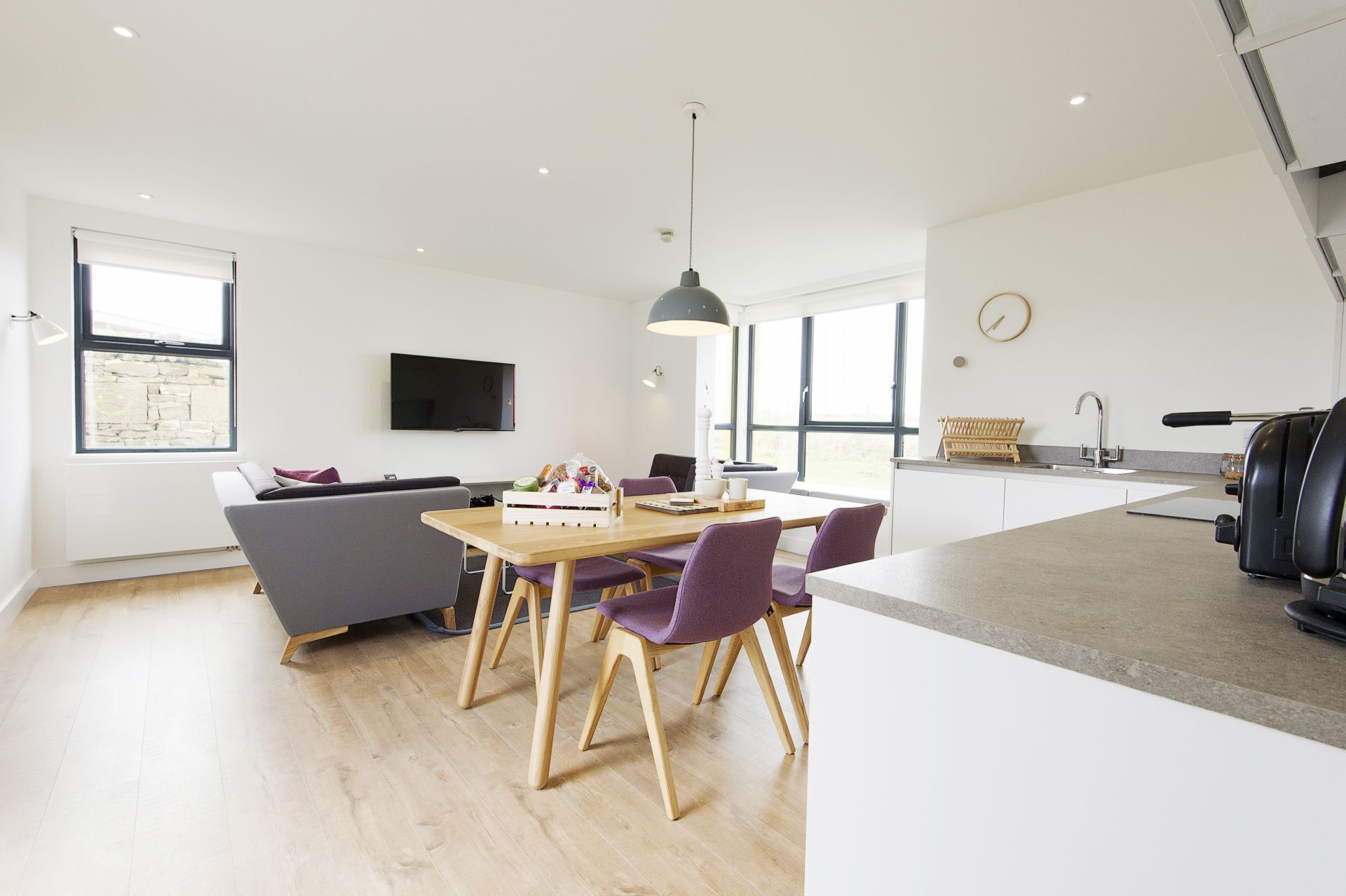 The apartment features a modern living and sleeping area, fully-equipped kitchen and bathroom. The windows provide a variety of vantage points for guests to enjoy far-reaching views of the dramatic John O'Groats coastal scenery.