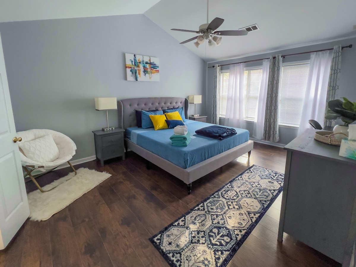 Master Suite with king bed, walk in shower in attached bathroom, walk in closet, 55 inch smart TV and great view from big window.