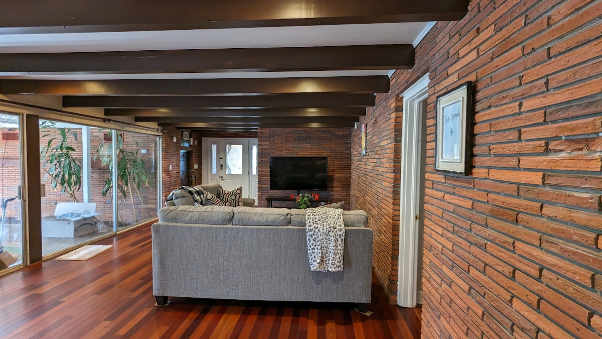 The 3-level house has 5 fabulous rooms, a large family room, dining room, living room, and best of all, a large fully enclosed interior garden. It has two gas fireplaces and televisions in all rooms and the family room.