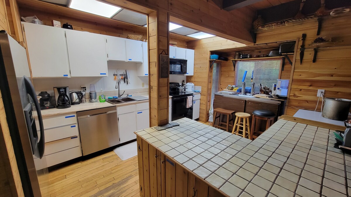 The lodge's common area is a grand masterpiece with exquisite craftsmanship and eclectic decor. Share the kitchen and bar seating area with fellow guests. The entire lodge is an artful showcase, reflecting owner Johney Engle's talent as a kitchen designer. His stone fabrication shop below operates Monday to Friday, creating some noise.