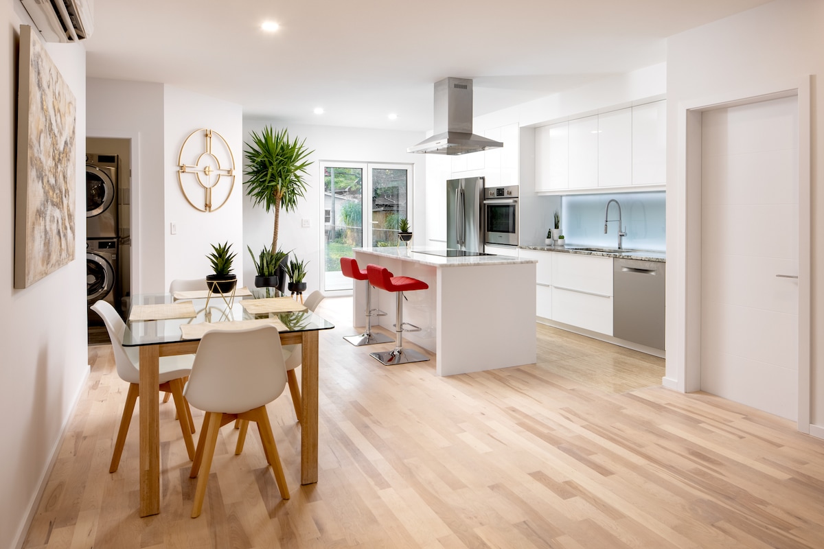 The Scandinavian inspiredkitchen features state-of-the-art appliances, quartz countertops, designated coffee &tea bar, anda large center island, perfect for preparing and enjoying meals with family and friends. Adjacent to the kitchen, the dining area offers comfortable seating for entertaining, with breathtaking views of the enchanting forest just beyond.