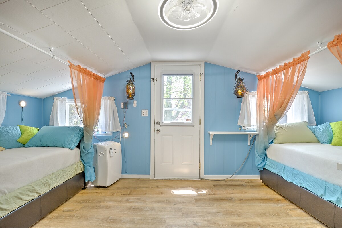 This gem is a new build, open concept kitchen/living room with vaulted ceilings and skylights. The bedroom has a queen size bed.