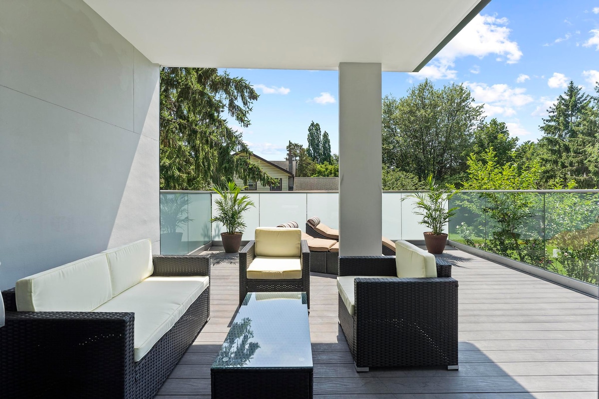 Step through glass patio doors onto the large deck, complete with cozy patio furniture, ideal for soaking up the sun or enjoying evening cocktails.