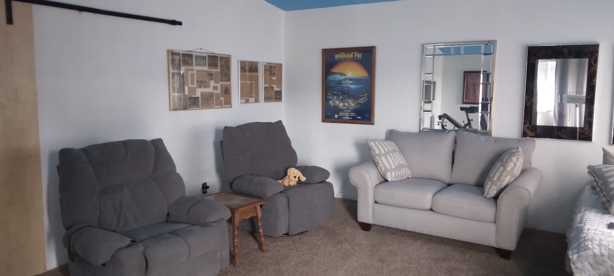 Private entrance with a large bedroom and living area. Small fridge, microwave and coffee pot included. Queen bed is new and comfortable. Sitting areas inside and on porch.