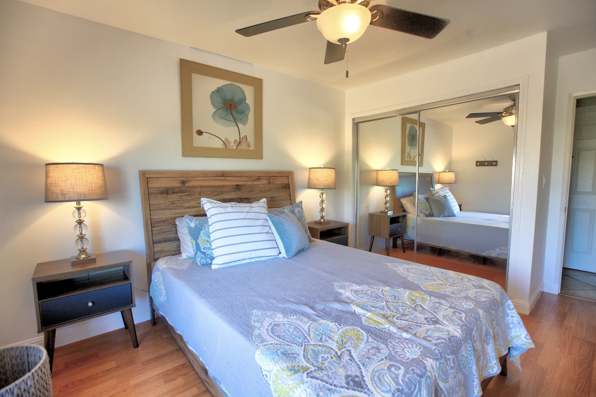 Villa Palmera - 1bd/1ba King Terrace w/Fireplace offers gorgeous views of the Santa Rosa Mountains and our sprawling desert courtyards. Our guests love the privacy of this single level villa and the convenient proximity to all the main clubhouse amenities that Legacy Villas has to offer. The main pool and children's pool are steps away from our front door. The main clubhouse is also where you’ll find our well equipped fitness center, clubhouse, outdoor wedding venue, hammock garden and Legacy Grille. If a quieter vibe is more you speed, then enjoy the quick walk across the hammock garden to the lap pool where you'll typically find adults in quiet relaxation soaking up the sun. With 12 pools and 11 hot tubs spread throughout the resort grounds, you’ll be happy to know that we have another pool and hot tub just beyond our front door where you will often be the only person there. So if you’re looking for a more social and kid friendly experience with roomy cabanas and pool side snacks at the main clubhouse or private relaxation closer to your villa, we have a host of options for you to enjoy the Southern California outdoors.