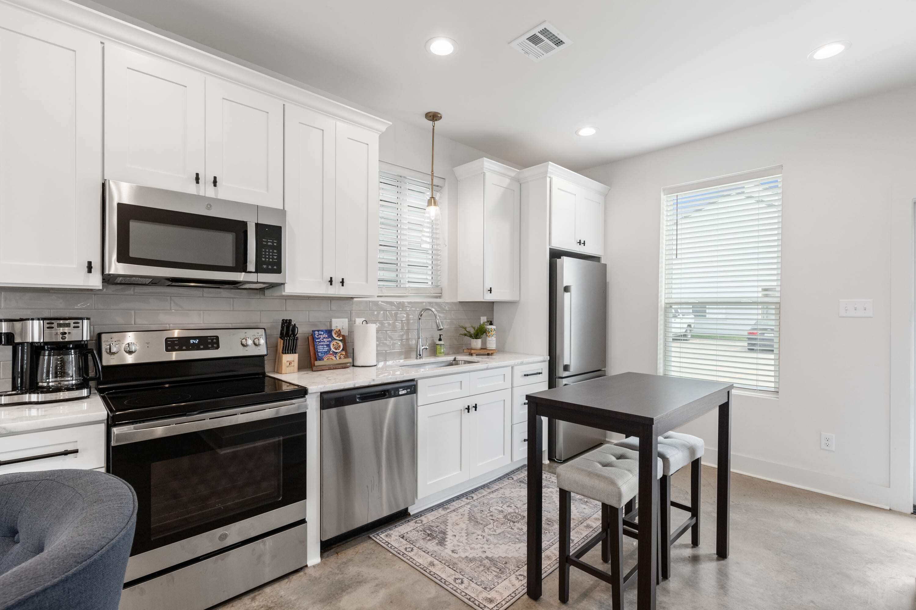 In one of Lafayette’s historic buildings, this penthouse is 2 bedrooms, 2 baths, & sleeps 6, with soaring ceilings, oversized windows, and a killer view of downtown. Wide-open living area, chef’s kitchen, and a master bathroom with a garden tub. Walk to Lafayette’s best bars, restaurants, festivals, and art spots—because everything is at your doorstep. Now under new management and in top form, this is your go-to downtown HQ for unforgettable stays.