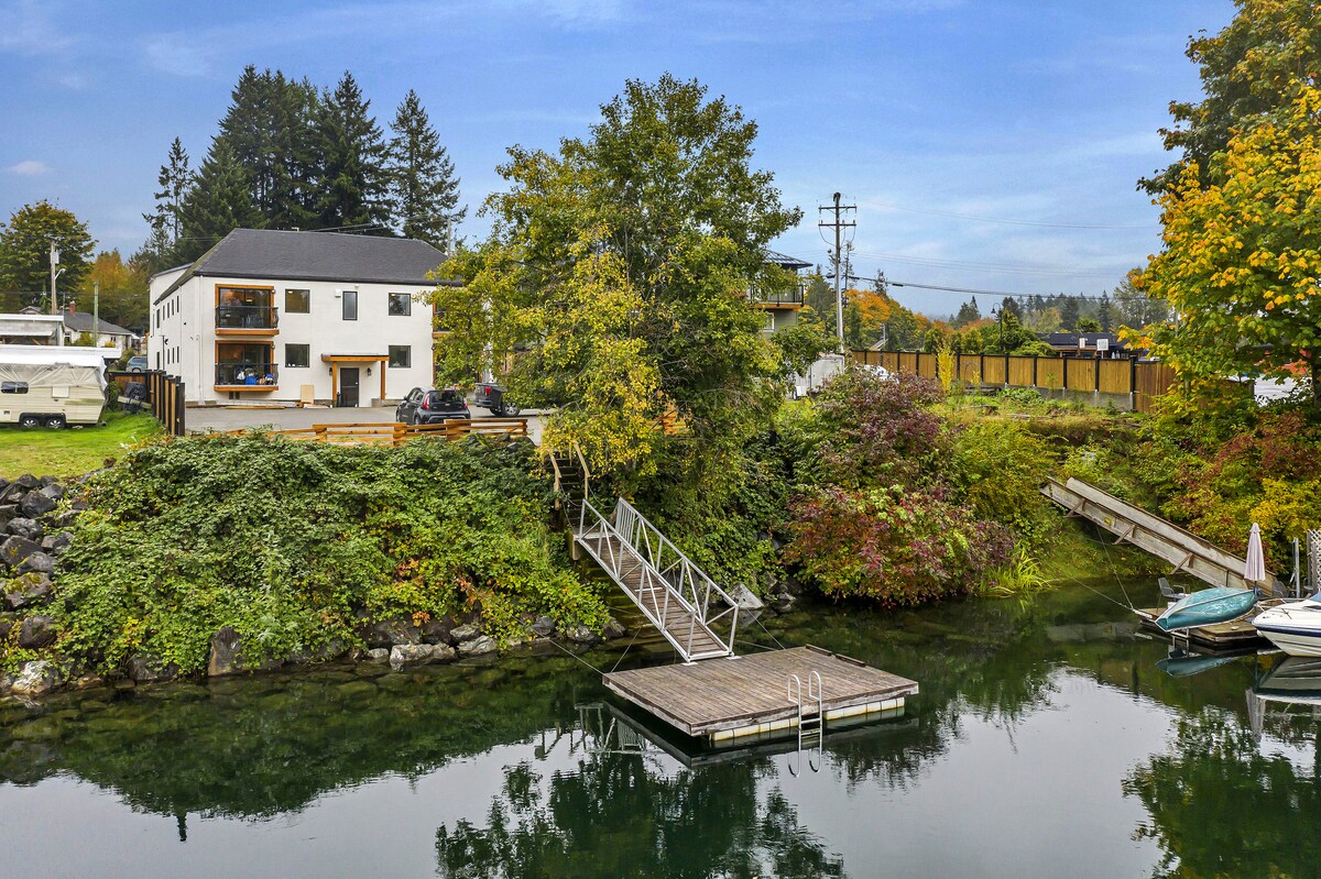 The backyard is private and fully fenced. The covered deck right off the living room looks down to the water, a grand stair case leads you to a huge 20x20 cement pad; perfect for hanging out on;