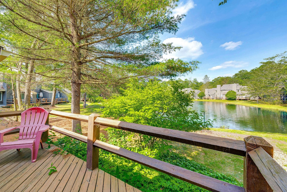 Open space living area with a 65” TV, queen sofa bed and sliding doors onto a small deck with a view of the woods, golf course and pond. There is a propane grill for your barbecue. Adjoining kitchen has everything you need. Downstairs, the Master bedroom has a king bed and its own bathroom. Second bedroom has a queen bunk on the bottom, twin on top and pullout twin trundle. There is a hall bath and a dry sauna. The cabinet has plenty of games for a rainy day.