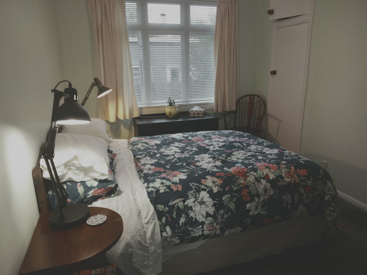 2 single beds in private room in comfortable, quiet 1950s stucco home. Away from road frontage , up long driveway, you can park your car off the road. Another bedroom with a double bed is listed separately.