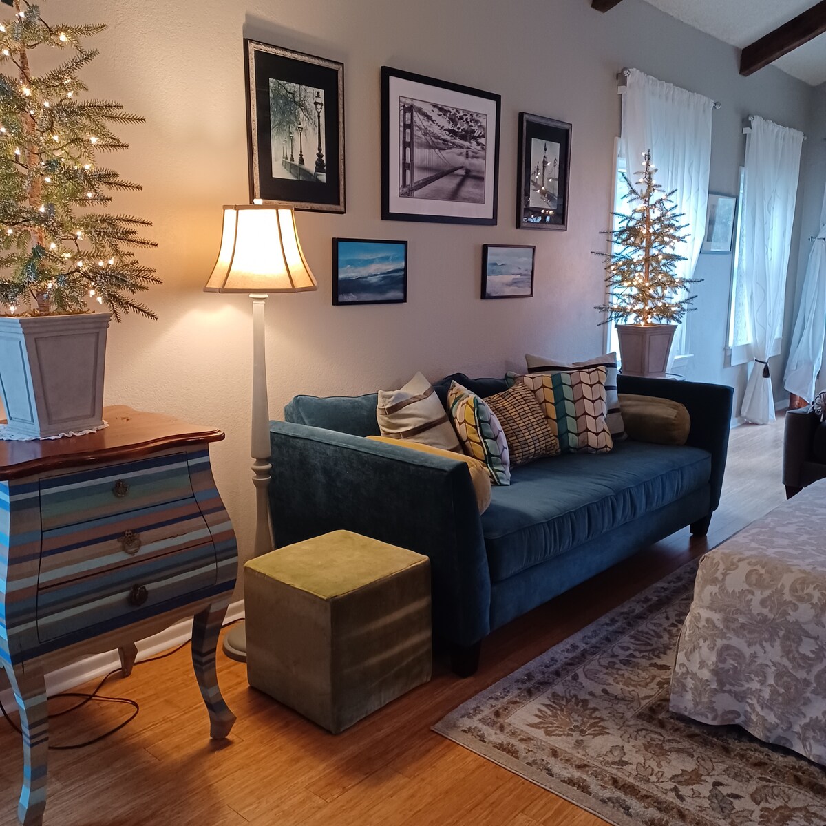 Cozy space with extra comfortable king size bed in bedroom with 3" memory foam mattress topper and alternative down pillows. Has a new ceiling fan, smart tv, and black-out curtains.
