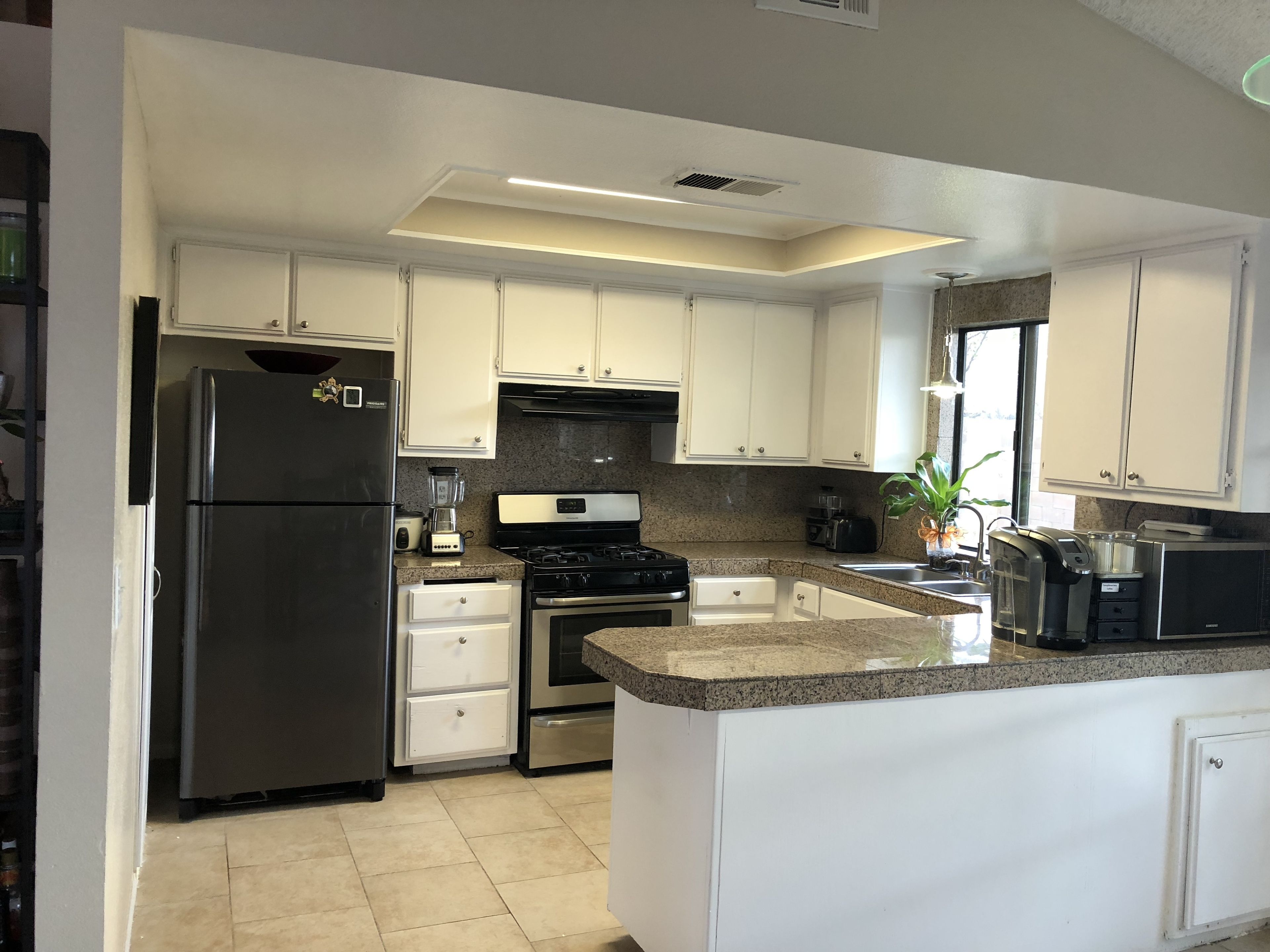 You will have your private entrance from garage. You may use the refrigerator in the garage. No cooking please, the kitchen and living room are not included in listing.