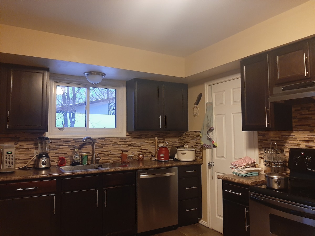 Absolutely fabulous place to stay. Awesome quiet neighbourhood. Easy to get to. Room is comfortable to stay in, 2 queen beds, big desk and office chair, arm chair/ sofa, closet. Shared Kitchen area is very clean and tidy. Large side by side refrigerator provided for use. Full range for all your cooking needs. Bathroom is complete with a large vanity to set toiletries on, with very large clean marble tiled showers. Washer and dryer also available for use. A comfortable area is set up to watch the TV in the shared common area of the rental.