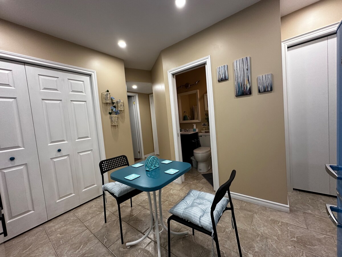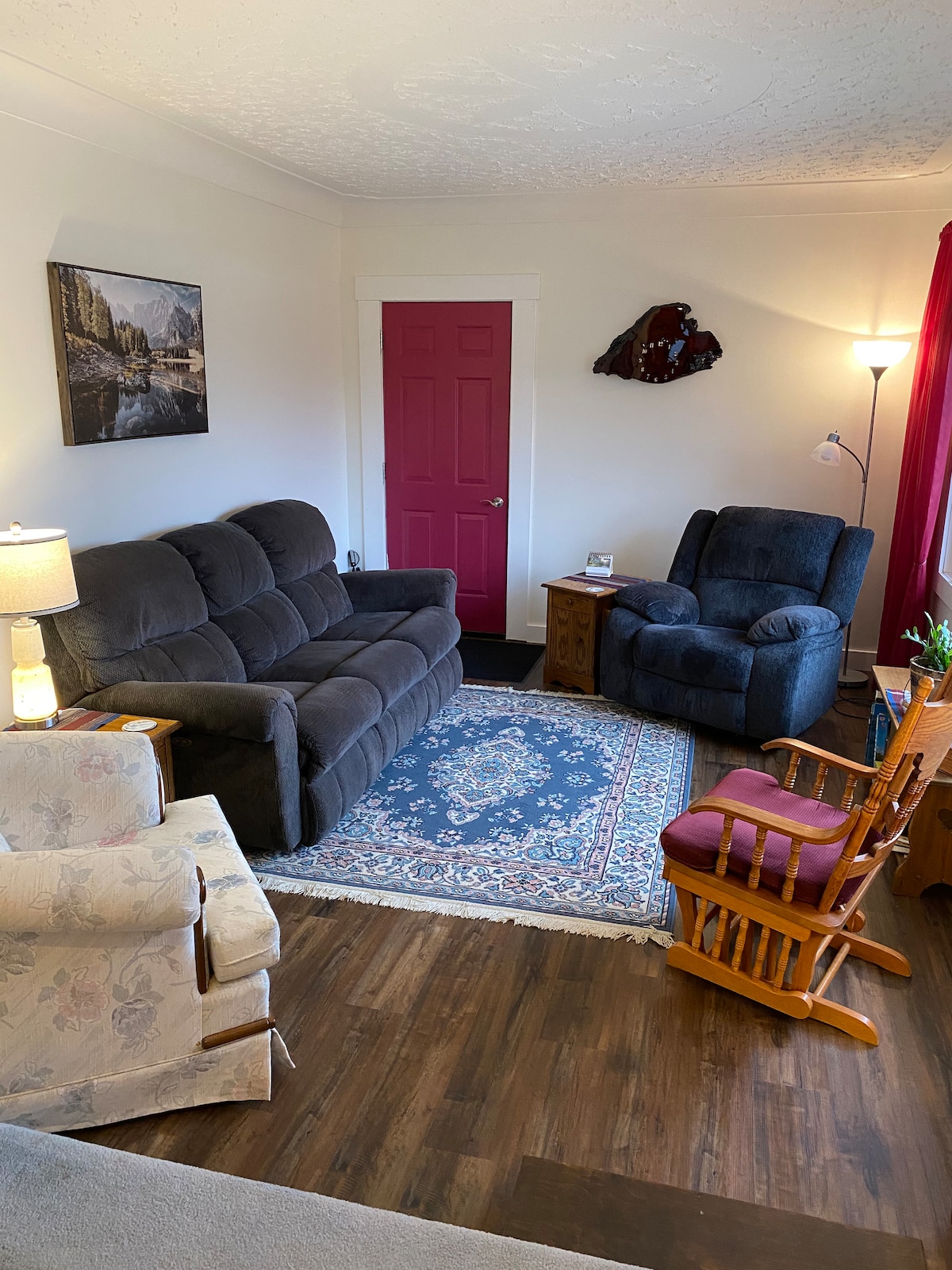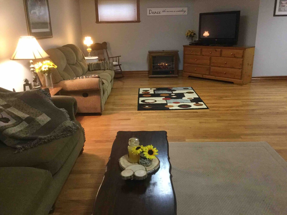 Spacious inviting room, lower level of our home ,keyless entry , with two queen size beds, lounging area, kitchen area, off that room, restroom 3 piece ,its like an apartment