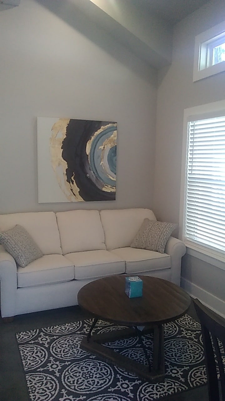 - Vaulted ceilings, modern electric fireplace, and natural light throughout