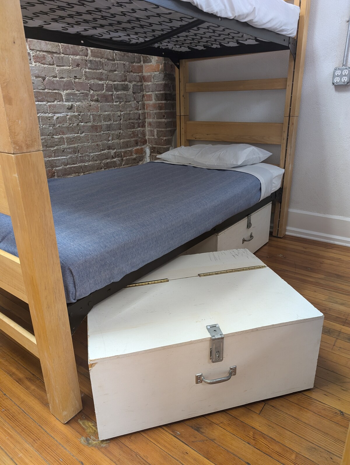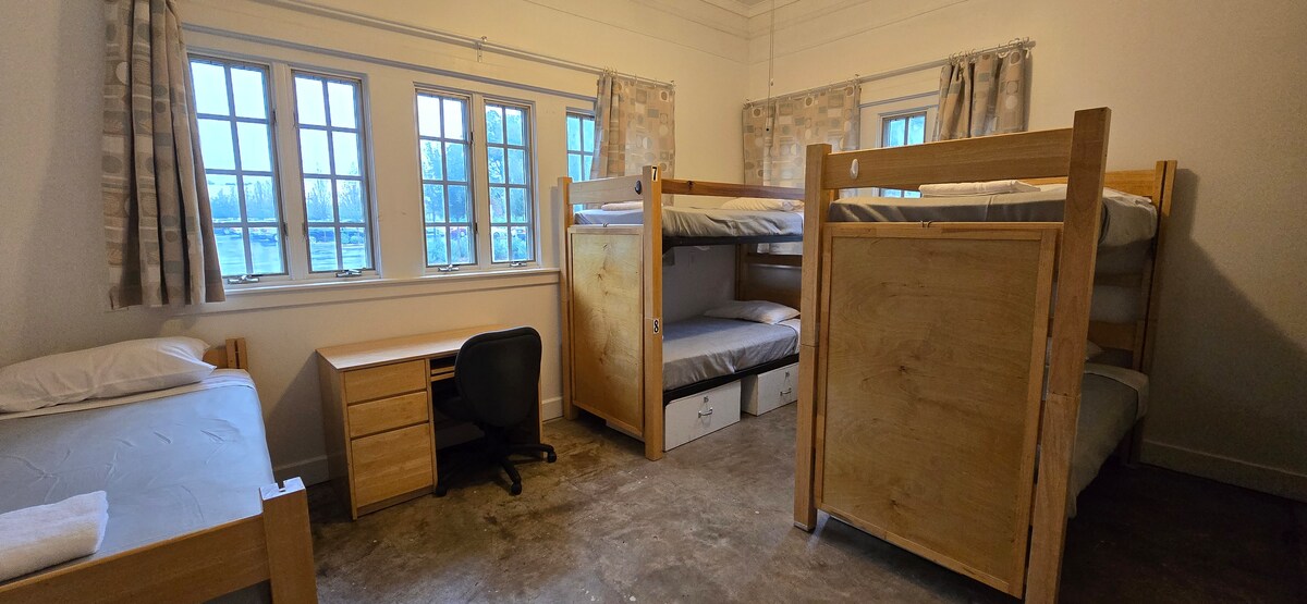 All beds are twin-size bunk beds. Upstairs, there is a women’s dorm with 6 bunk beds (12 people max) and a men’s dorm with 8 bunk beds (16 people max). Both dorms have bathrooms within. Downstairs, we offer an accessible/co-ed room with 2 bunk beds and one single bed (5 people max). Bathroom is not connected to the suite.