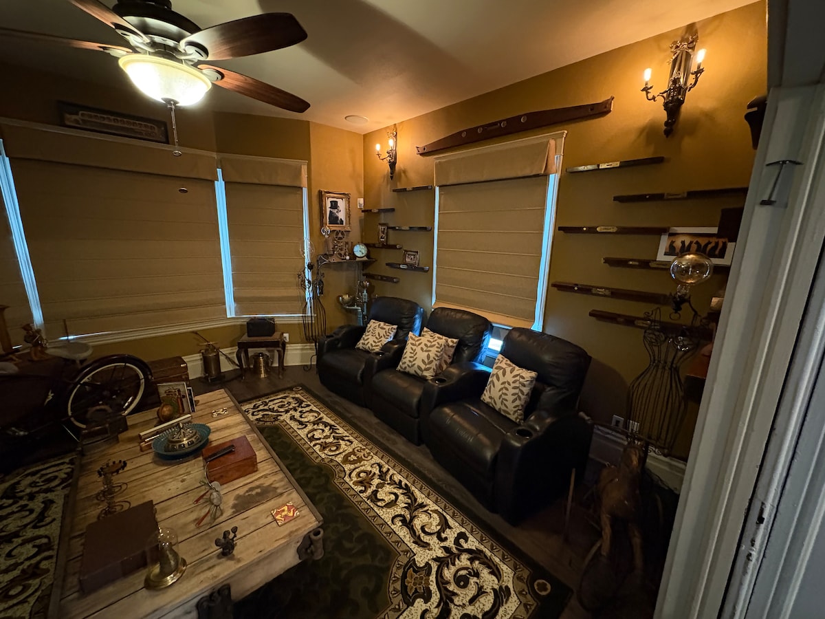 Enjoy yet another room to gather! This room features a fully-stocked bar cabinet (accessories, not the booze itself :), four lounge chairs around a coffee table, and two chairs at a small table that’s perfect for some 1-on-1 board games and conversation.