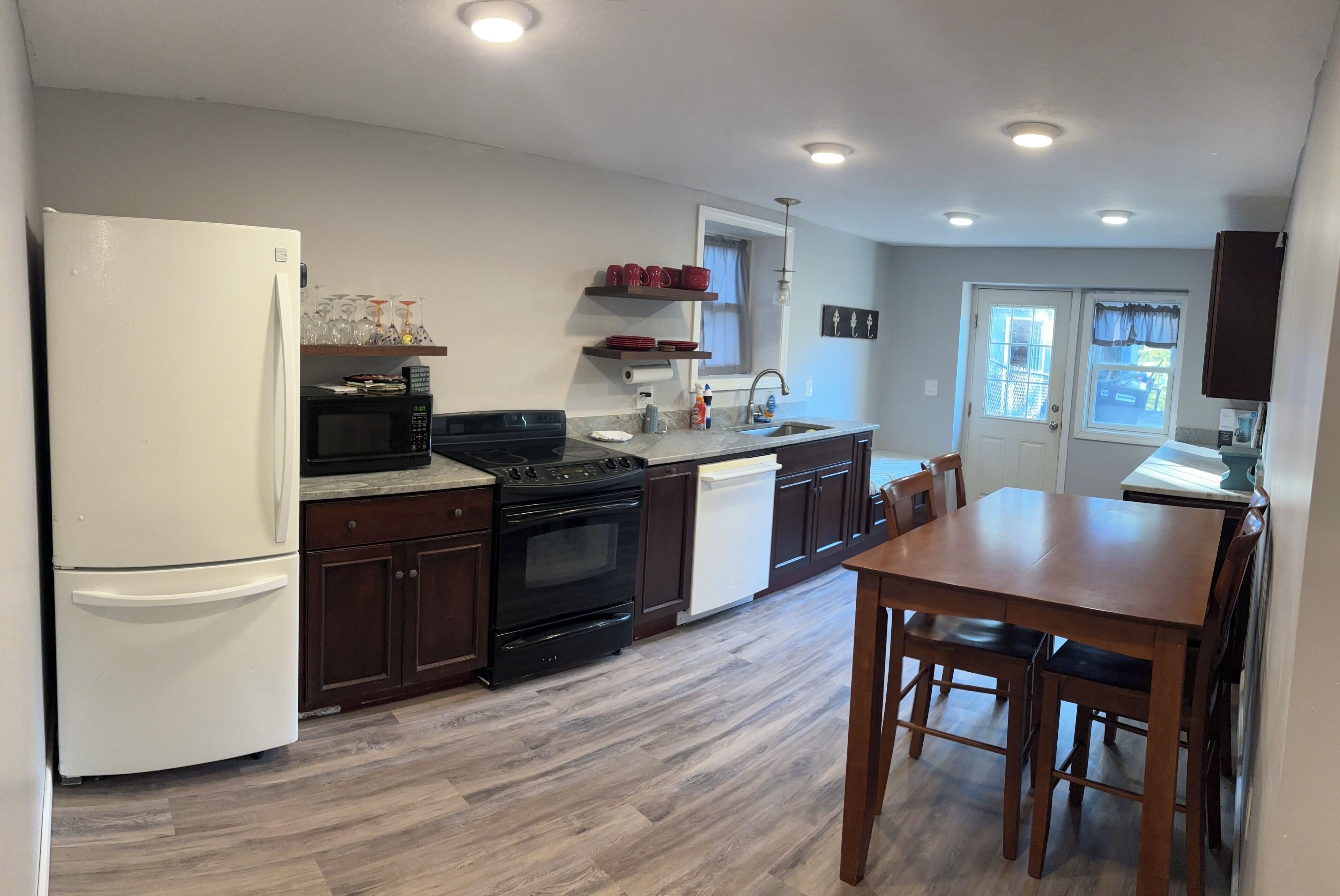 Cozy in-law apartment equipped with full kitchen, dining table, sofa with pull out bed, bedroom, full bath, washer and dryer.