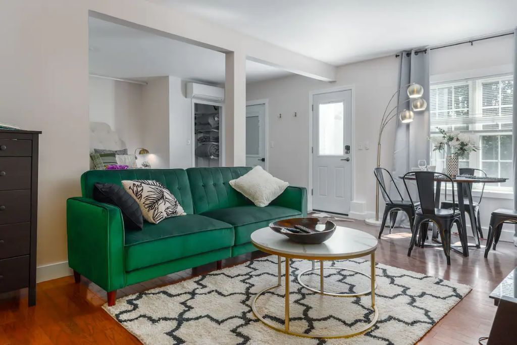 Living room/Dining area: The sofa pulls out to full bed and can also accommodate 2 people. Extra sheets and blankets are located in the storage under the chaise lounge. 50 inch Roku Tv that guests can log into their streaming apps and will automatically sign you out on your departure date. Dining table with 4 chairs can also be used as a workspace or place for games.