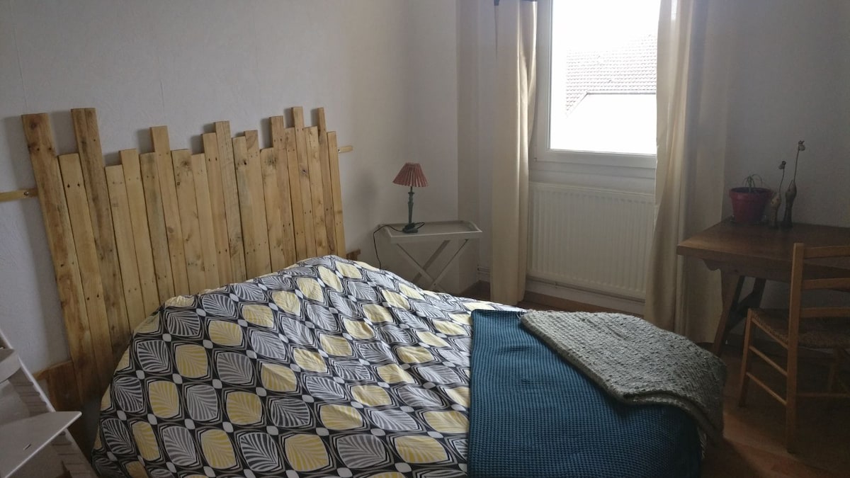 Large room on the 1st floor of a quiet house in a small village. Queen bed, chair and desk. Shared kitchen, bathroom reserved for guests. Shared dishwasher, microwave and fridge. (microwave dish and no real cooking + strict cleanliness rules. Bed made and towels available. Classic breakfast provided (2 slices of bread, butter, jam, coffee or tea) NON-SMOKING terrace. Free street parking Shops nearby. Option to put your bike in the garage
