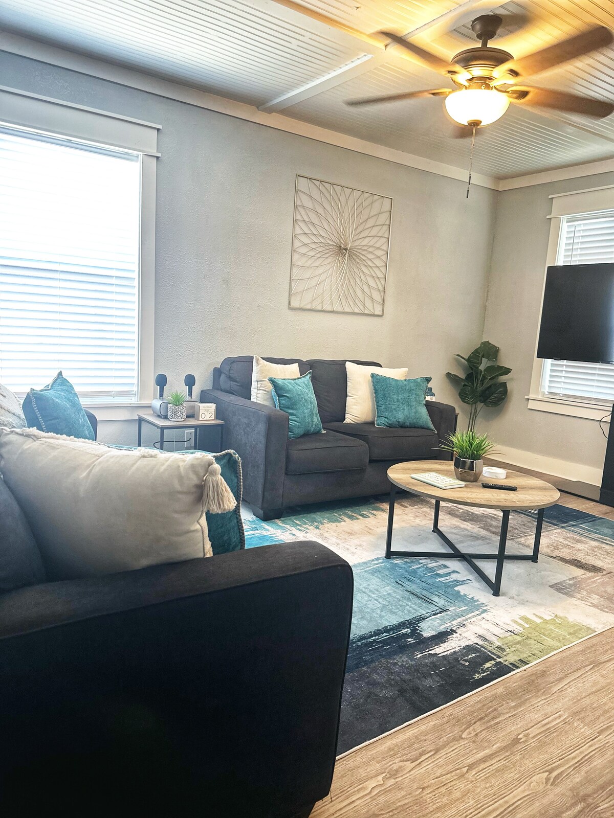 Access to your room, the living room, bathroom and kitchen. The living room is a loungy vintage vibe, the kitchen is spacious with a pub table, standard appliances (minus a microwave) and washer/dryer. Laundry is available for $7/load. Modern bathroom. Central a/c and ceiling fan in your room.