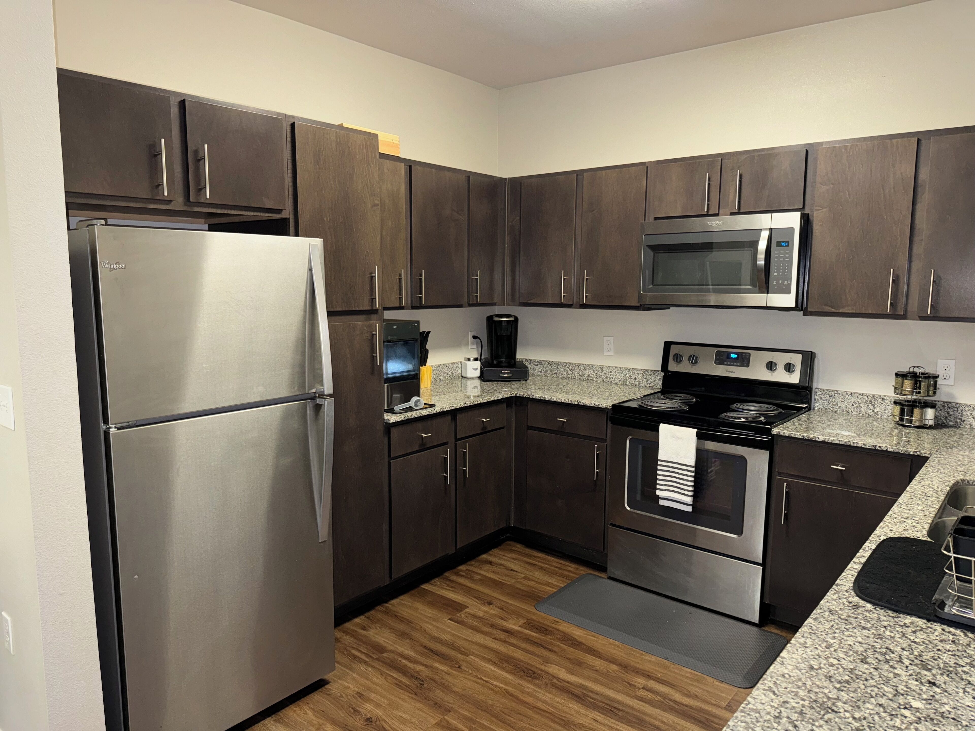 - Kitchen with Microwave, Oven, Refrigerator, Stove;