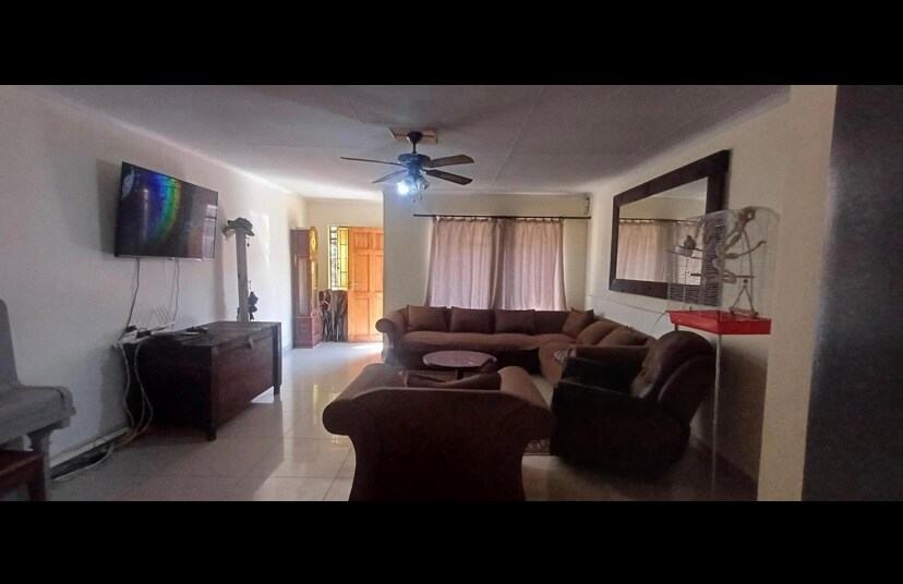 The house boasts 3 spacious bedrooms and 2 bathrooms. Each of the spacious rooms has a queen-sized bed, large built-in cupboards and a desk . The first lounge leads off a long front verhanda. There is also a large living room with a smart TV, loungw,fireplace and dining area. The kitchen is fully fitted with all basic amenities.
