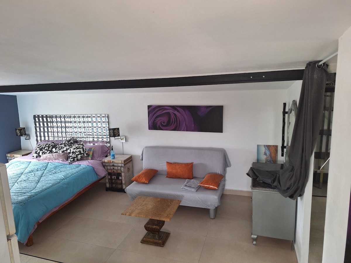 Between pool and house invites a small garden to the sleepy linger under the trees and on the covered terrace is a relaxing drive out the day. From here you get to the ground level house directly into a spacious and cozy living and dining area, the modern and fully equipped kitchen to open occupies half of the floor space. Two doors lead to an airy modern bathroom with an open shower and a romantic bedroom with double bed and clothes drawers each. In the living room, the sofa-bed for a third person can fix up.