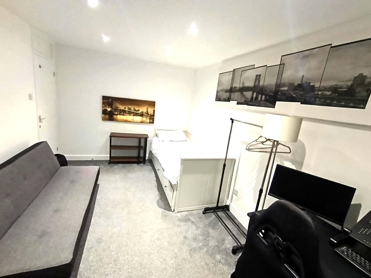 There is an en-suite king sized bedroom on your left with a neat shower room.