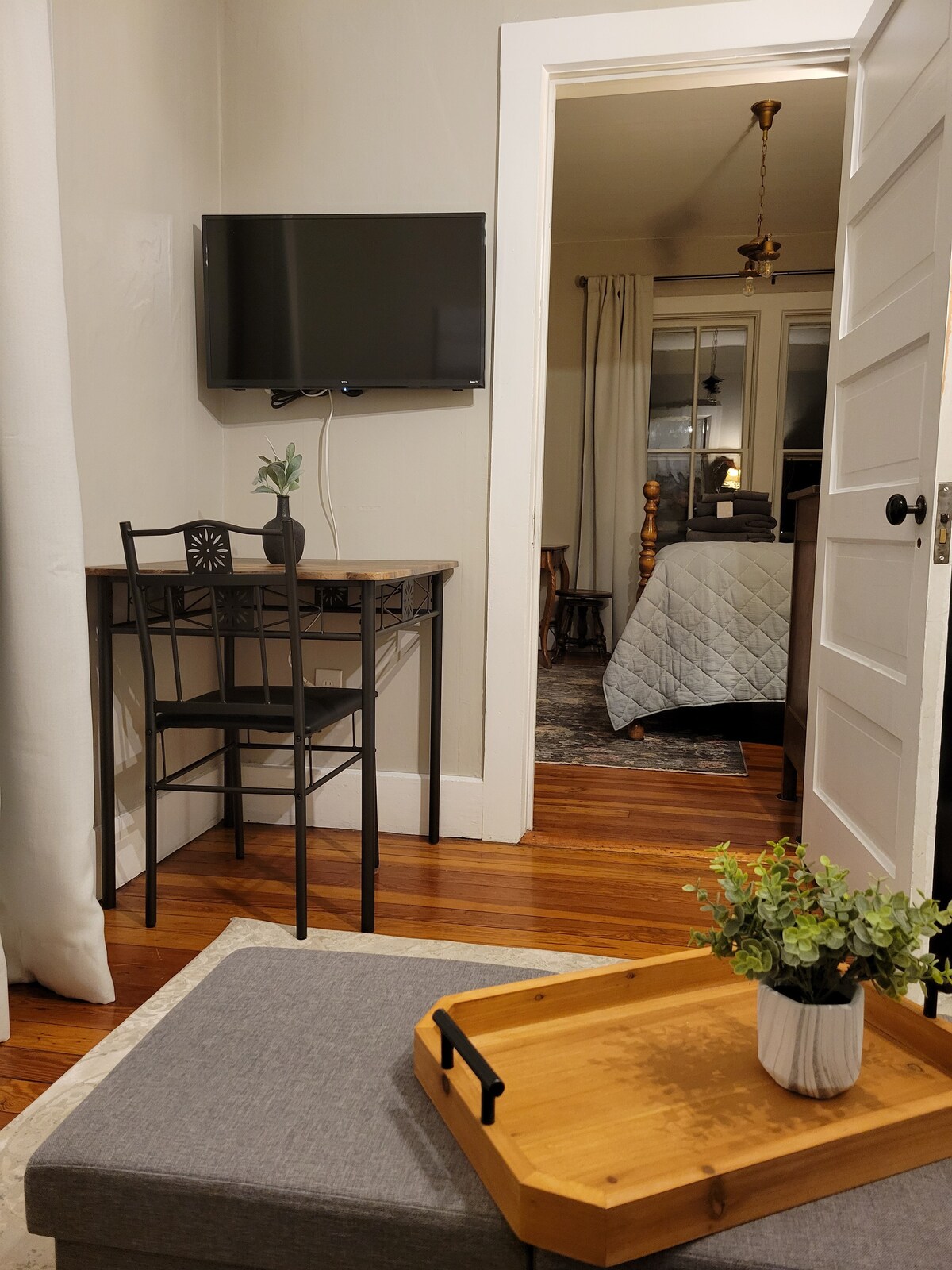 ✔ Bedroom: New King Bed (premium firm foam). Large closet, lots of mirrors and a makeup desk. 55" smart TV. Quiet fan and space heater for extra comfort. Easy to close off from living room with large barn door.