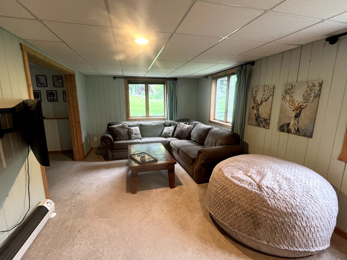 Downstairs, you'll find another bedroom and a cozy family room, ideal for additional guests or movie nights. A laundry room with washer and dryer and a second bathroom with a shower provide added convenience during your stay. Central heating and air conditioning ensure year-round comfort, while smoke and carbon monoxide alarms offer peace of mind.
