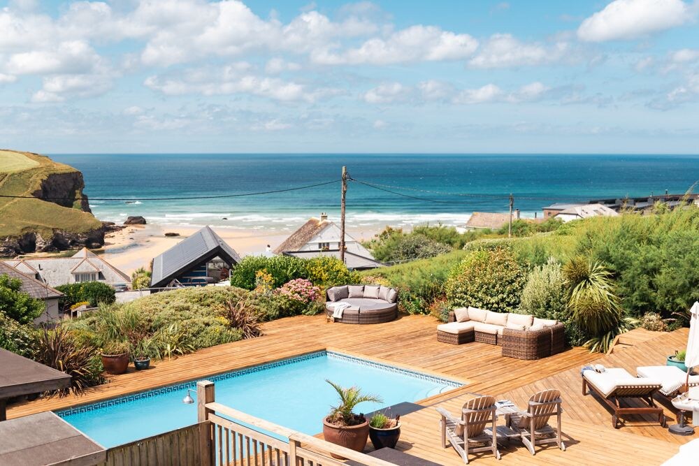 Terrace to the front of the retreat with views over Mawgan Porth, featuring a brand-new hot tub, heated swimming pool (open from 1st of May to 1st of October) and cold outdoor shower, outdoor kitchen with barbecue and bar and garden furniture, the perfect space for summer evenings.
