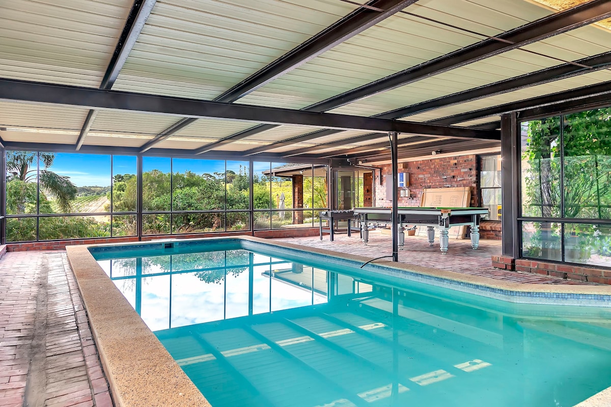 You will LOVE sitting out on the huge full length vine draped pergola, enjoying the breath-taking views of surrounding vineyards, the beautiful garden and bird life, whilst enjoying a wine, a platter, or your morning coffee. The kitchen is equipped with a Nespresso Coffee Machine. Wi-Fi and 65 and 55 inch TVs are also included. The main bedroom has a KING bed and huge en-suite. Bedroom 2 has a KING bed and Bedroom 3 and Bedroom 4 have QUEEN beds. (Please note that to access Bedroom 4, you have to walk through Bedroom 3). This home has reverse-cycle air conditioning. There is also a large covered and paved outdoor area that can be closed off by roller blinds. Quality furniture and linen. The swimming pool is accessible from November to Easter. Not suitable for toddlers.