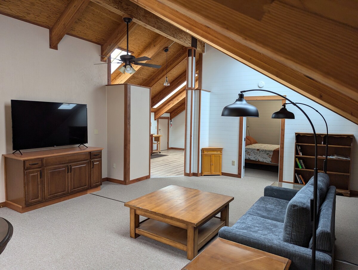 The place is the separate upper level of a large two-story home, in a forested setting. The space has an abundance of natural lighting from skylights throughout, and beautiful wooden cathedral ceilings.