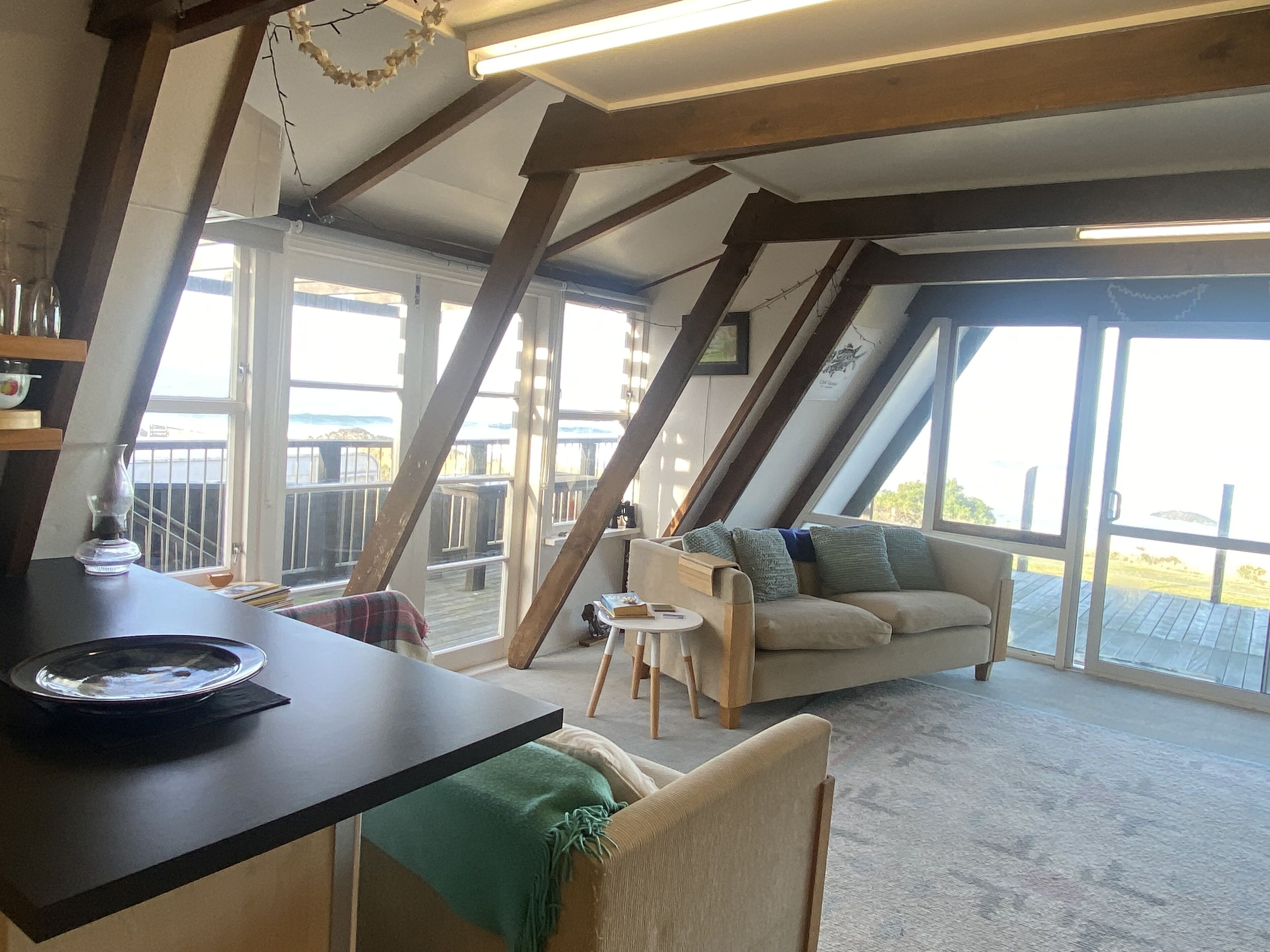 Panoramic views of the sea/beach from every area. New joinery in kitchen, which includes new fridge plus oven and under-bench freezer. Bathroom has shower, toilet and washing machine. Large decking area that is partially covered with clear-light and is like an outdoor living area. Boasting a 4 meter outdoor table. Fully fenced off area with compact lawn to relax.