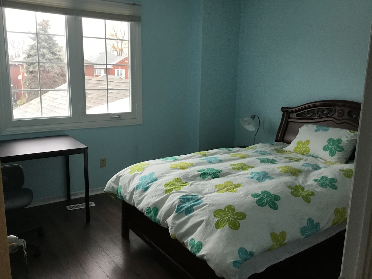 This room has 2 beds located on the top floor. Maximum of 2 people in this room. It is a Large detached house in a quiet and safe neighborhood. Close to public transportation and backs into a park. Close to schools and shopping malls. 15 minute drive to Pearson international airport. Bright and spacious house with big backyard with a deck to have fun gatherings.