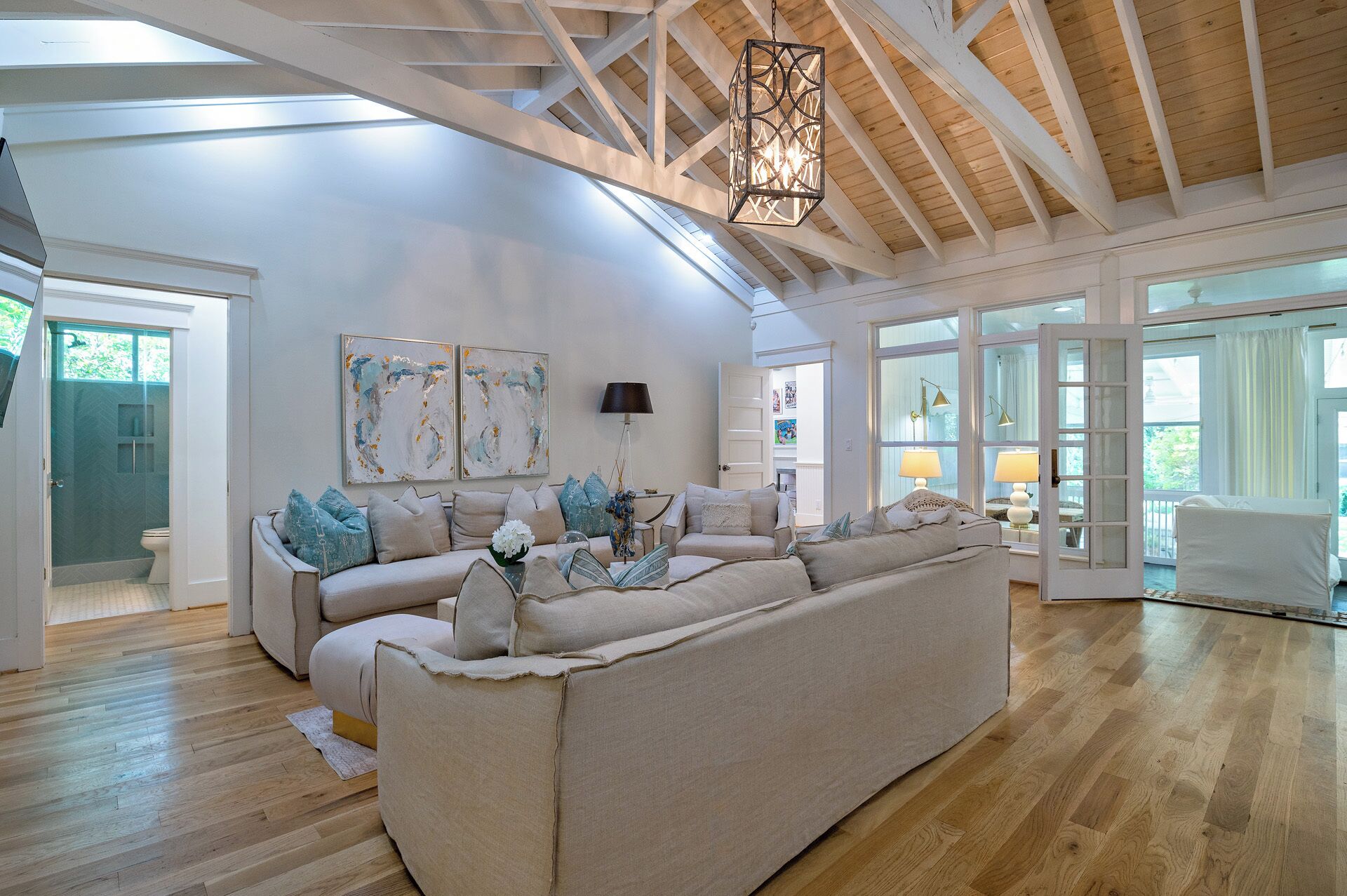 The front bedroom is a haven of comfort, offering ample space, a smart TV, and two queen beds with brand-new memory foam mattresses for dreamy nights of rest. Across the hall, the back bedroom presents a king bed and another TV for ultimate relaxation.
