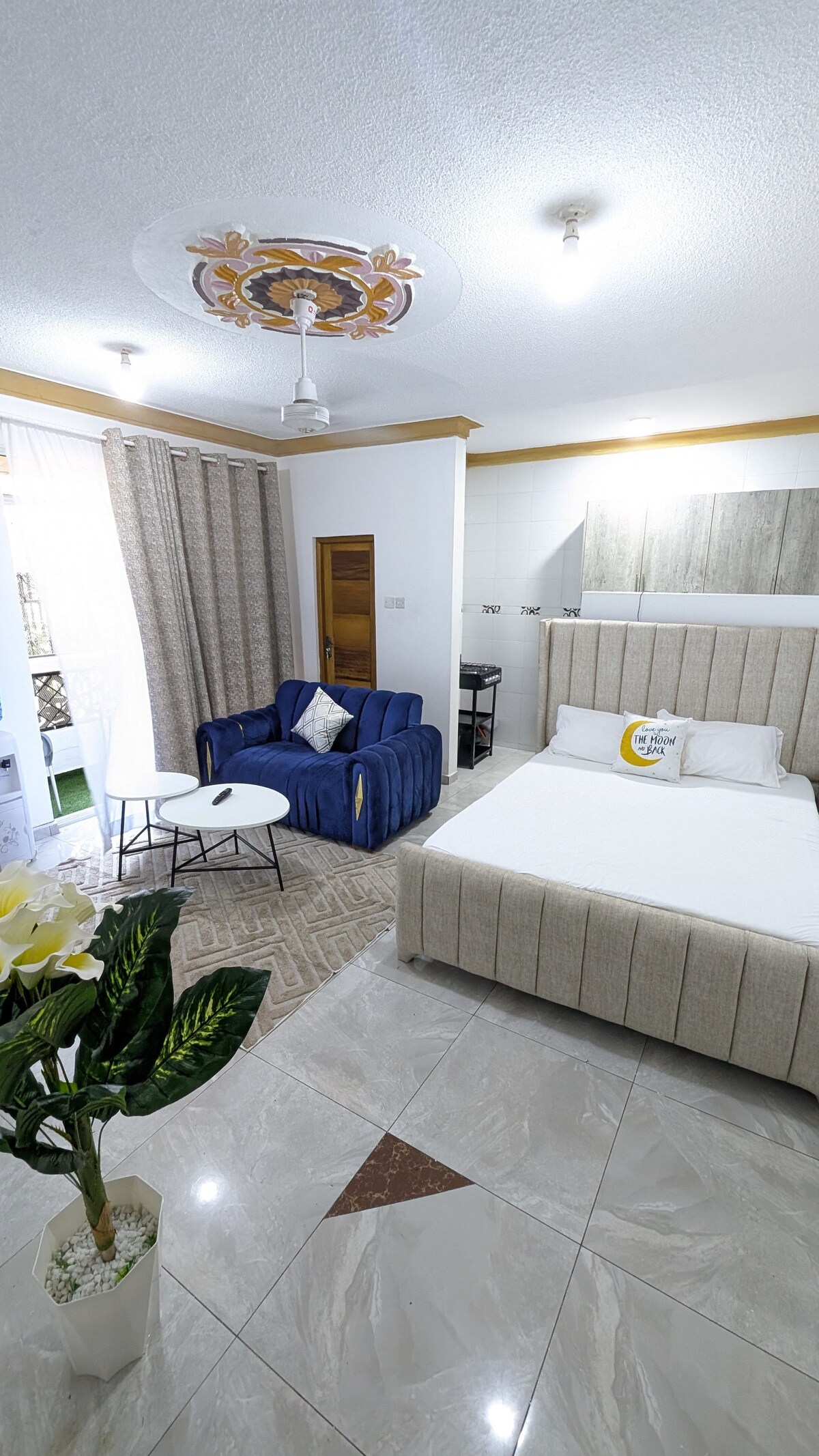 This cozy studio is located in heart of Bamburi which is ideal for guests on a budget but want to enjoy the coast.Being a few minutes drive to the beach , Nyali city mall, ,Haller park, Nguuni Santuary you are assured of value for money in a cool and safe location.