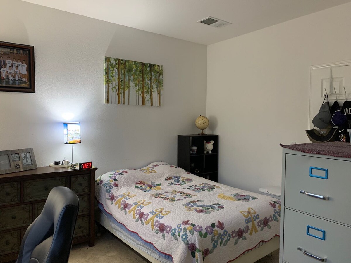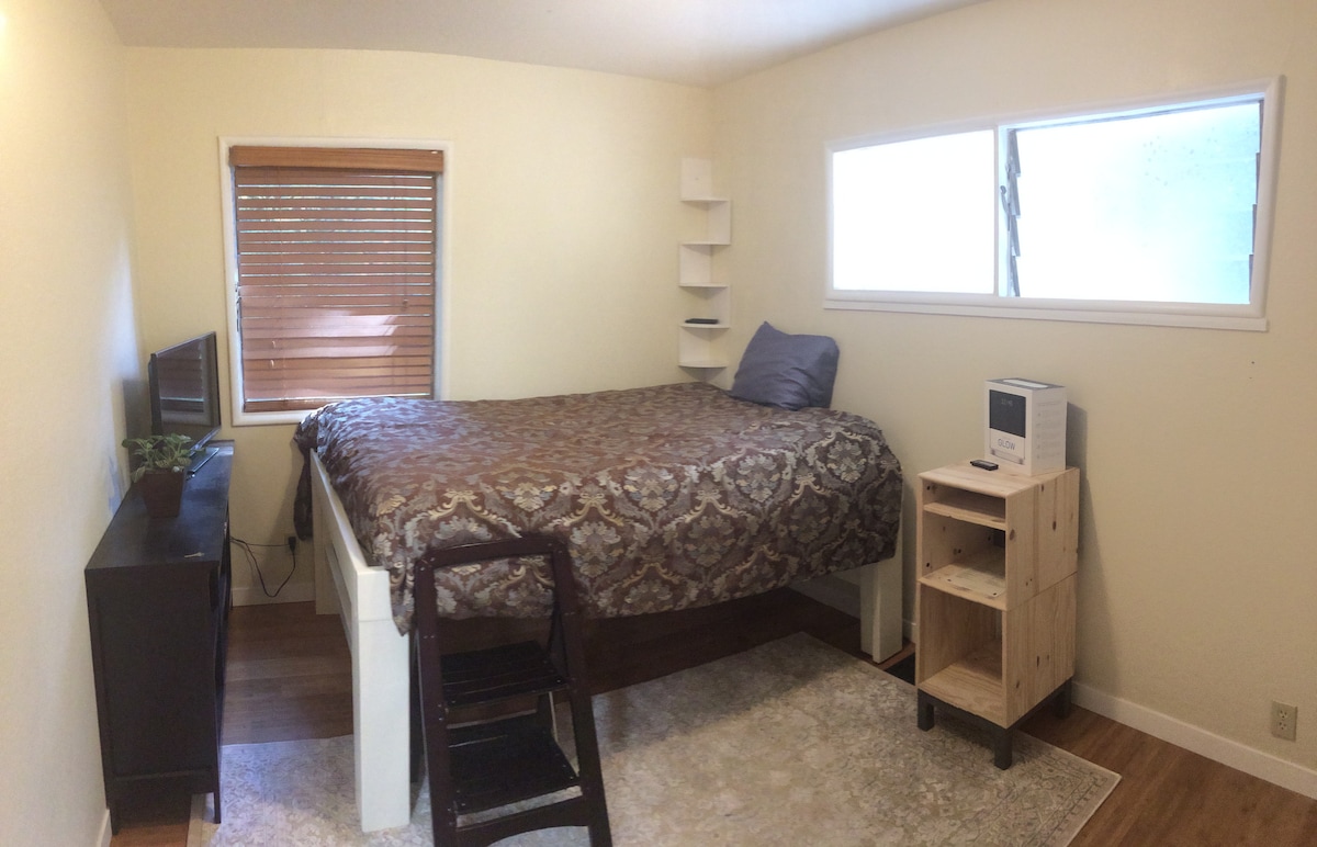 Bedroom has a private entrance, private bathroom most of the time . TV with fire stick, dresser, small closet, desk and comfortable chair, mini fridge , microwave, toaster, An electric water kettle, Coffee maker, coffee and tea . Also a portable heater, and a portable fan. *No kitchen or laundry facility .