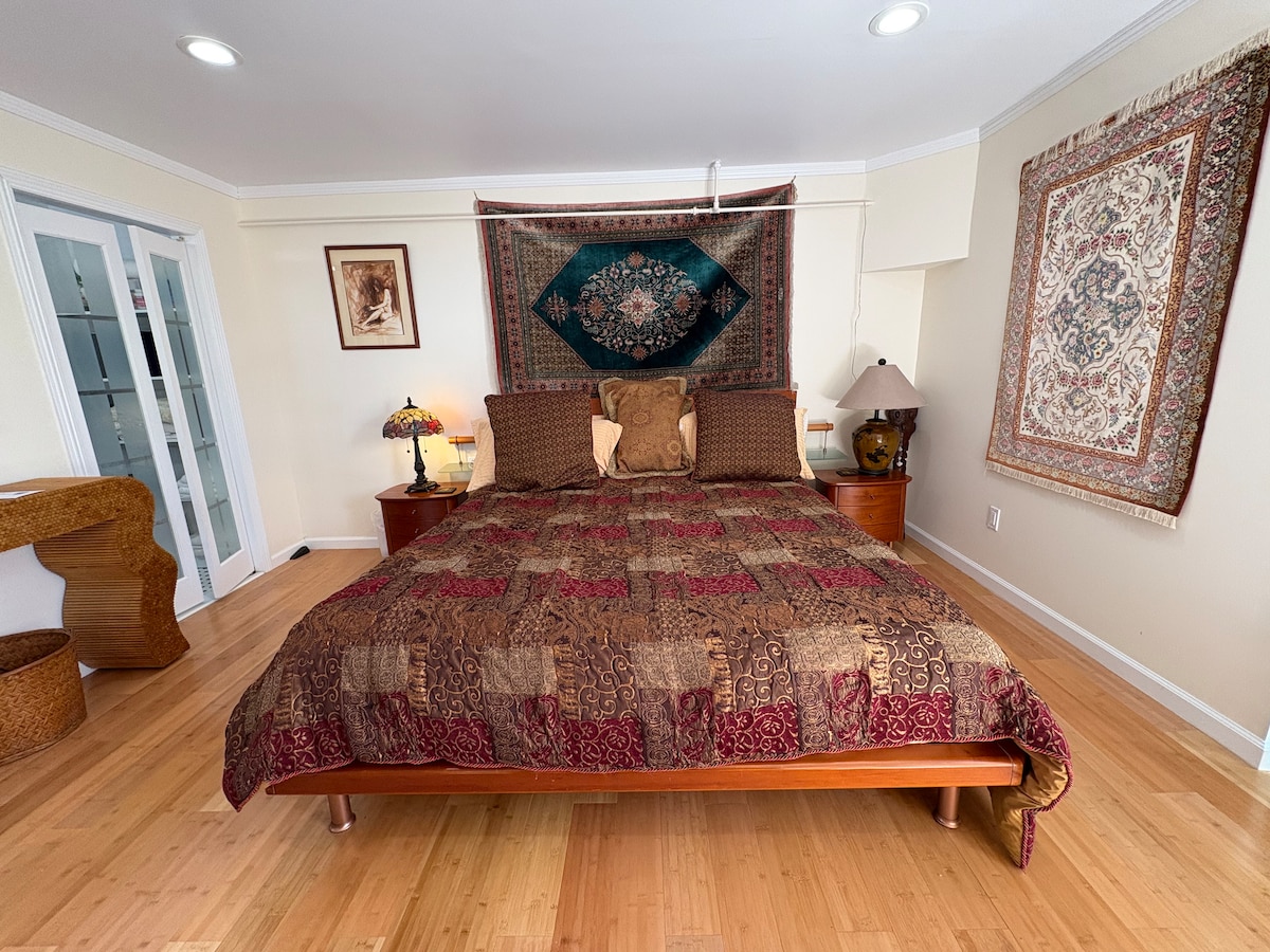 The Master bedroom featuring views from the large windows has a king-sized bed with French doors leading to the covered balcony